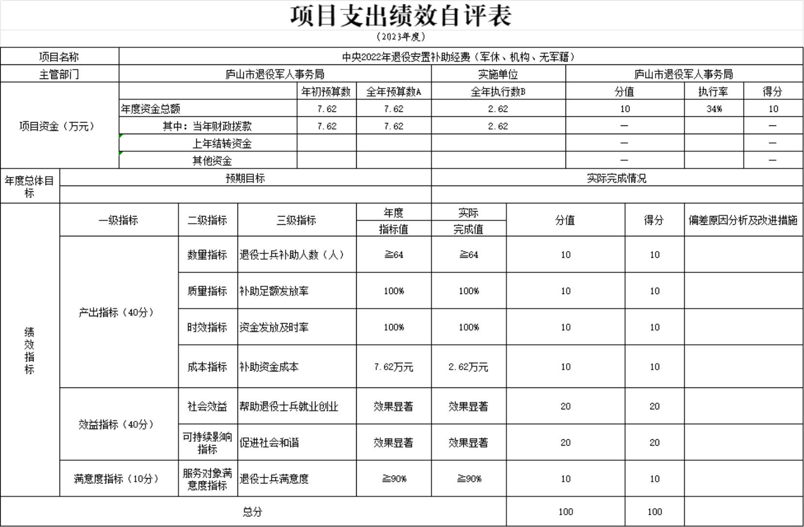 本单位中央2022年退役安置补助经费(军休、机构、无军籍)项目支出绩效自评表”如下: