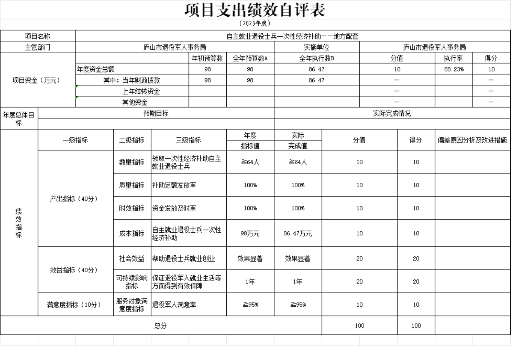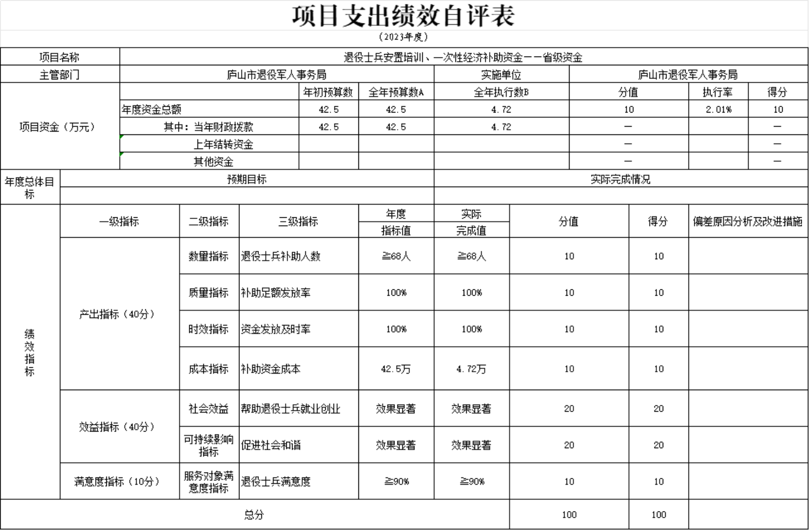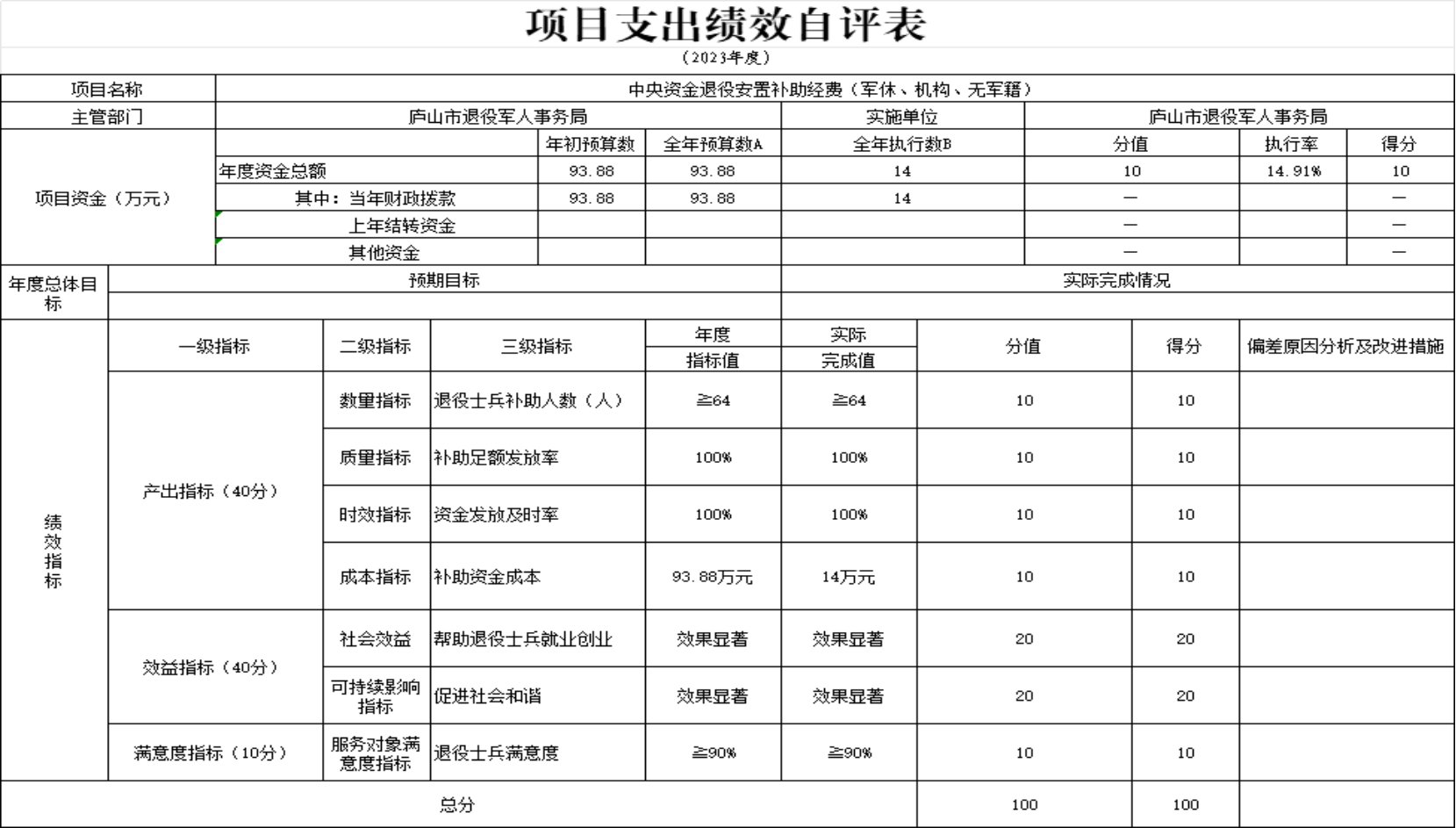 本单位退役士兵安置培训、一次性经济补助资金项目支出绩效自评表”如下: