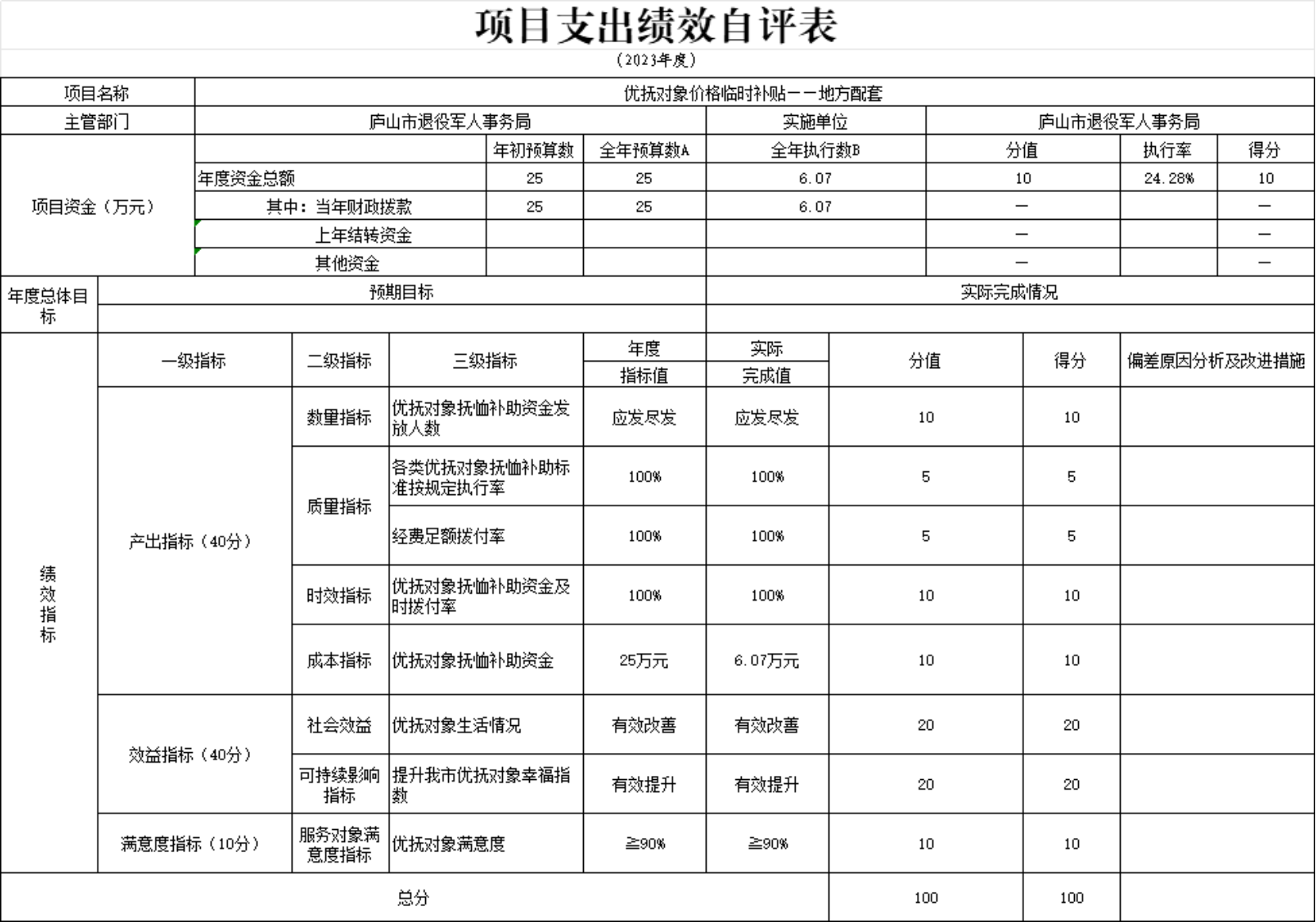 本单位优抚对象价格临时补贴——地方配套项目支出绩效自评表”如下:
