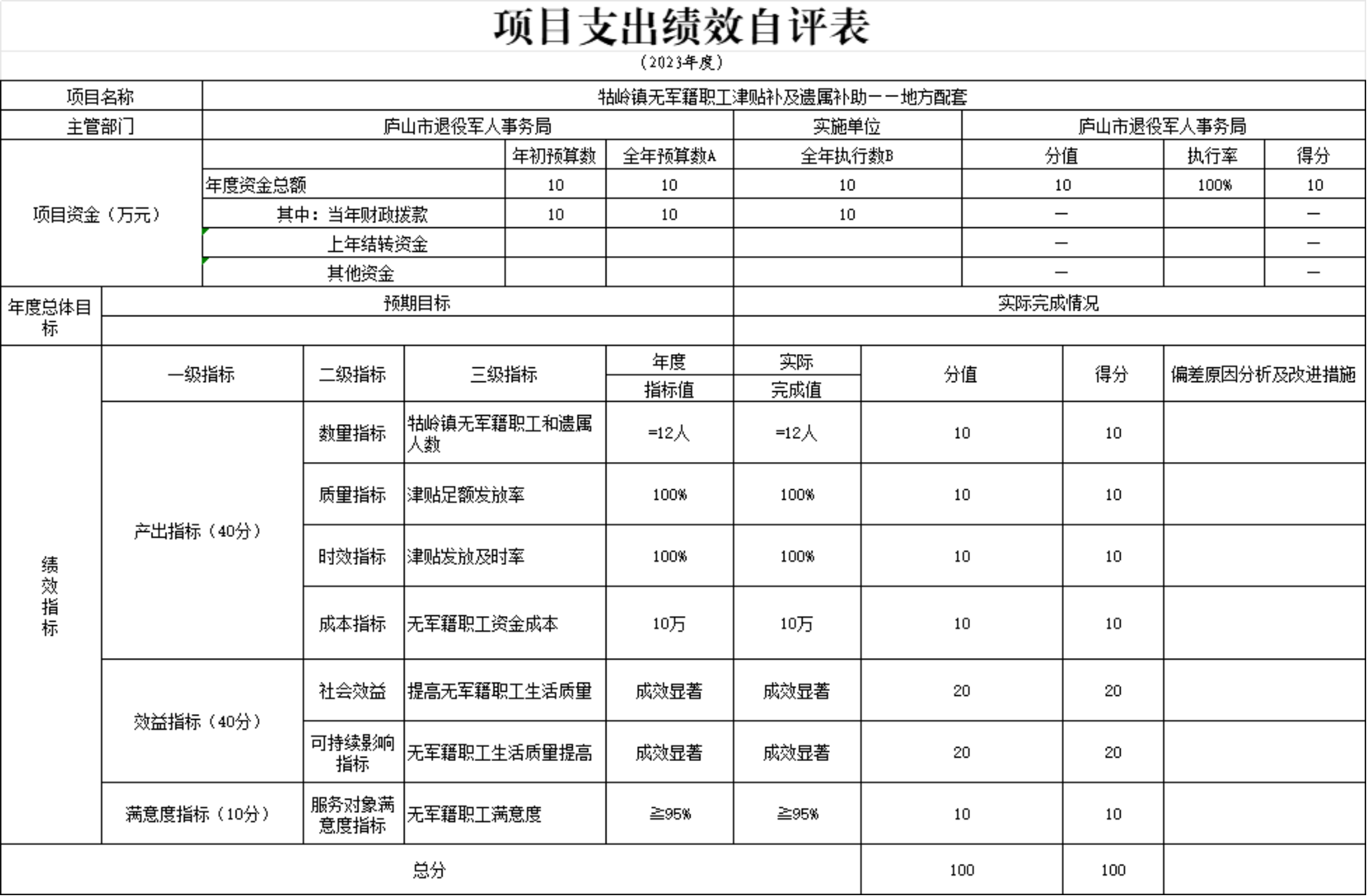 本单位牯岭镇无军籍职工津贴补及遗属补助项目支出绩效自评表”如下: