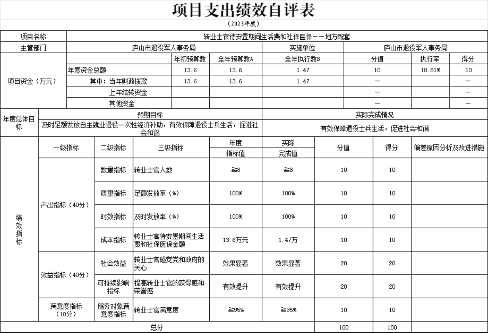 本单位转业士官待安置期间生活费和社保医保项目支出绩效自评表”如下: