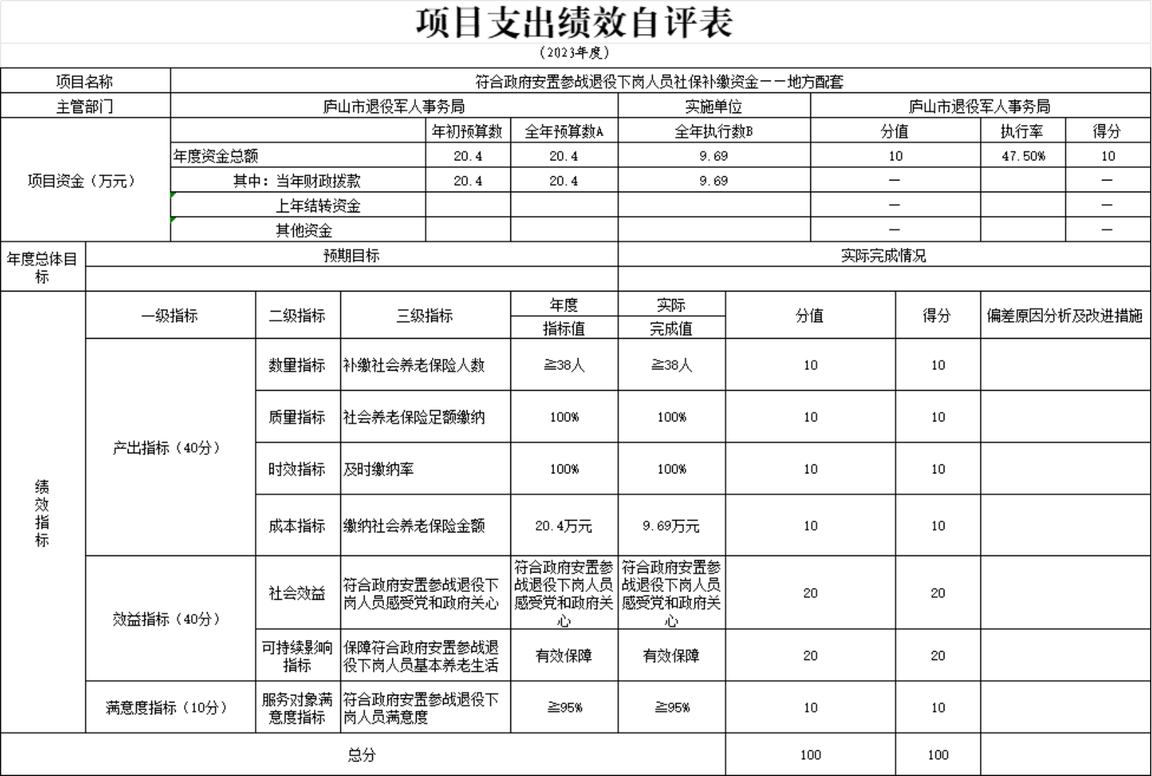 本单位符合政府安置参战退役下岗人员社保补缴资金项目支出绩效自评表”如下: