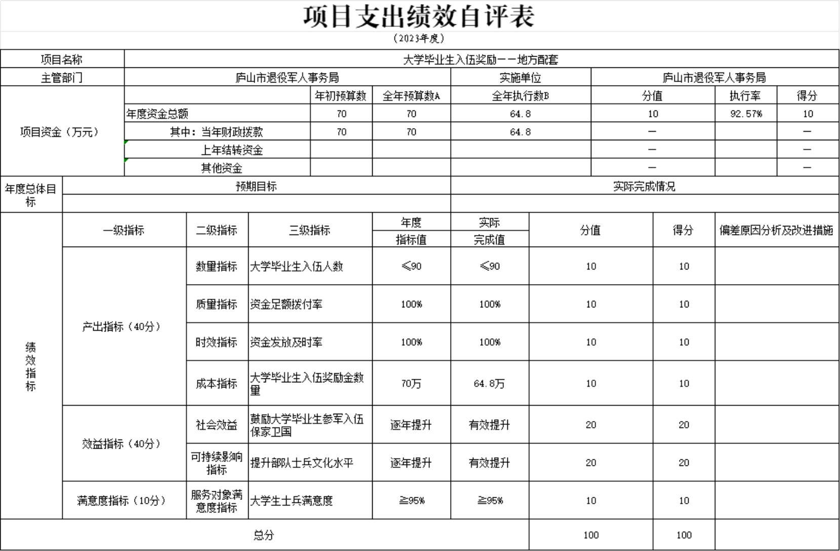 本单位大学毕业生入伍奖励项目支出绩效自评表”如下: