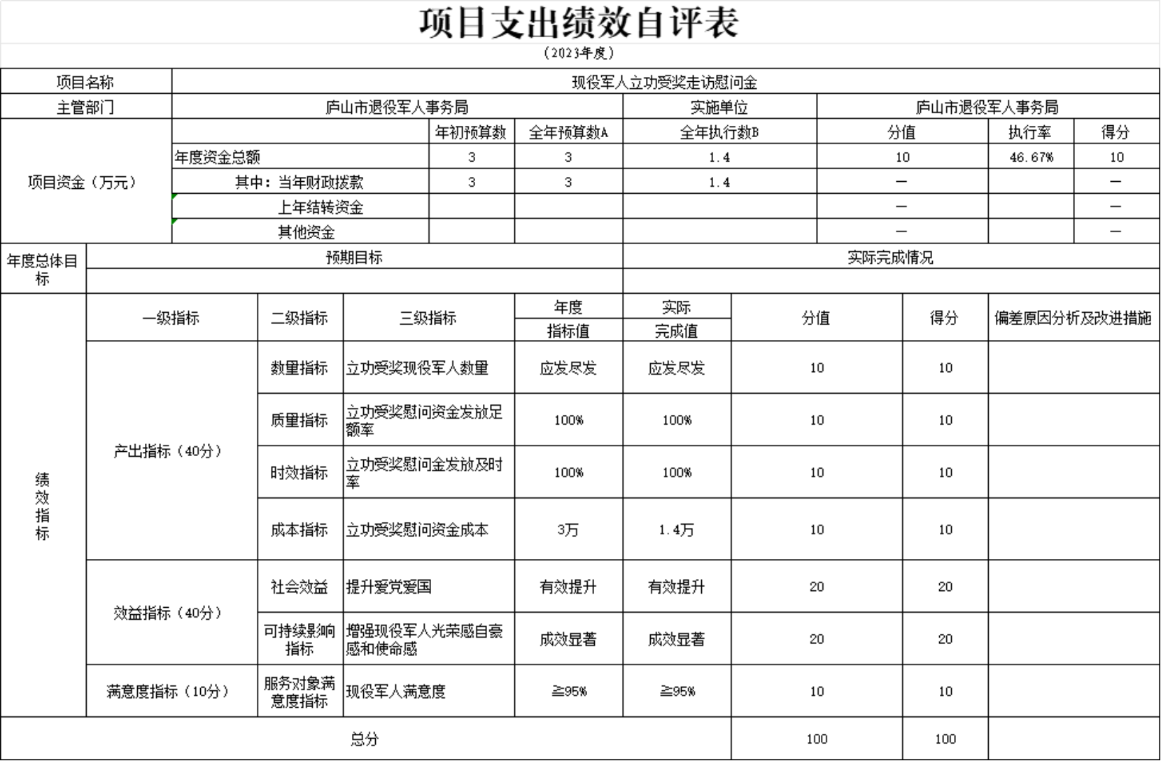 本单位现役军人立功受奖走访慰问金信项目支出绩效自评表”如下: