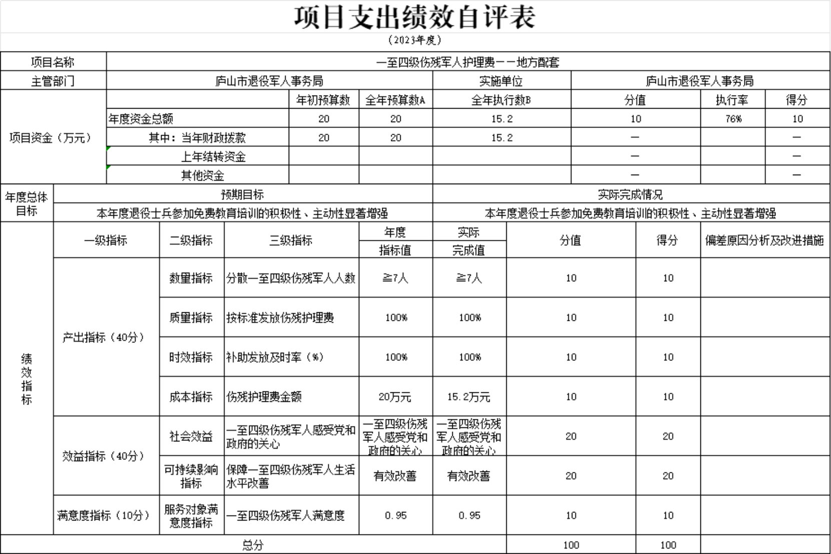 本单位一至四级伤残军人护理费项目支出绩效自评表”如下: