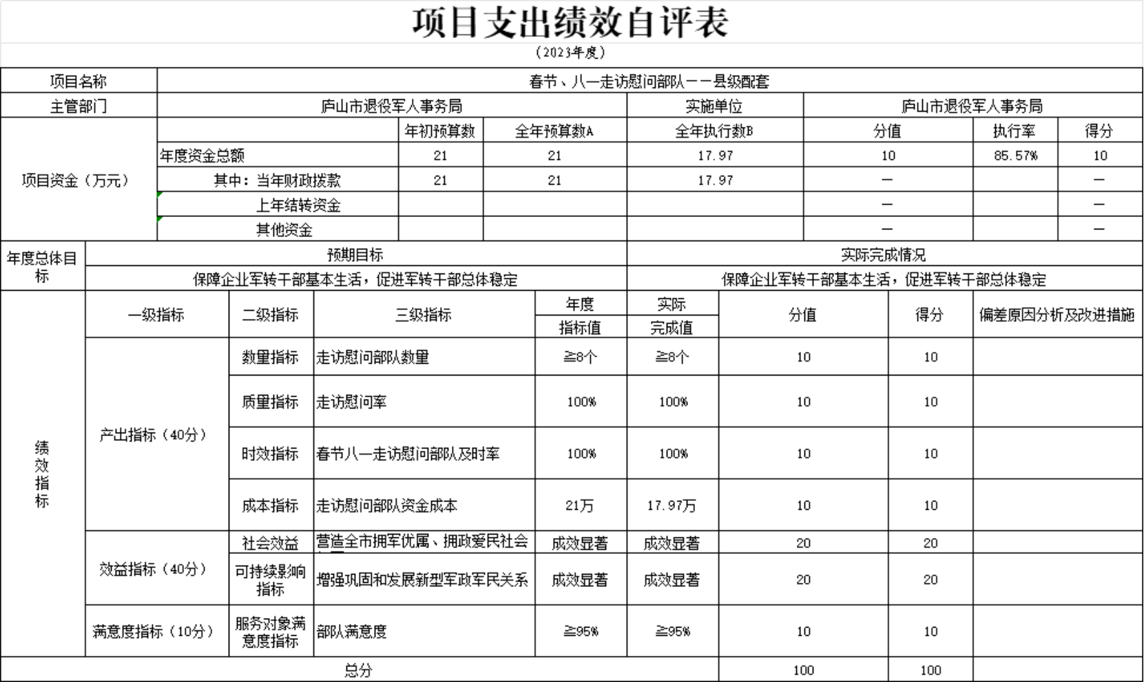 本单位春节、八一走访慰问部队项目支出绩效自评表”如下:
