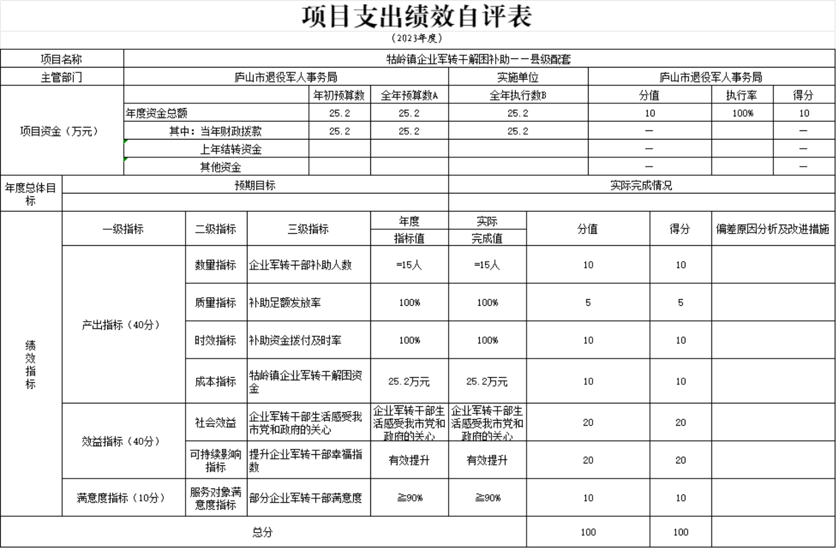 本单位“部分企业退役军队等人员企业军转干解困资金——省级资金项目支出绩效自评表”如下: