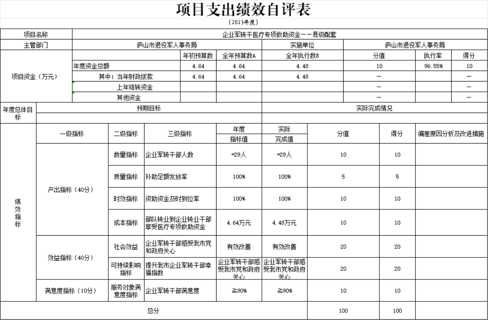 本单位企业军转干医疗专项救助资金项目支出绩效自评表”如下: