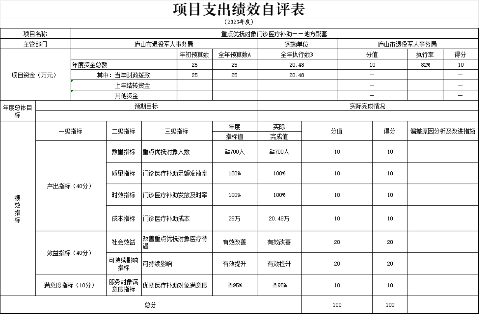 本单位重点优抚对象门诊医疗补助项目支出绩效自评表”如下: