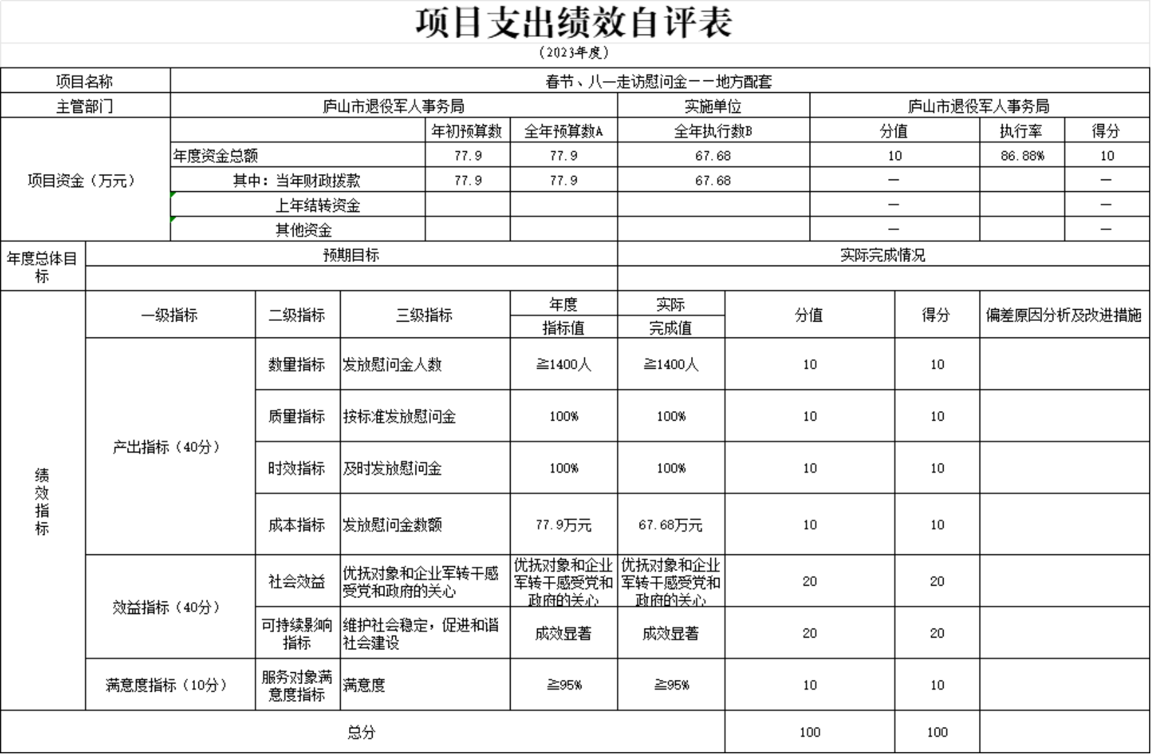 本单位春节、八一走访慰问金项目支出绩效自评表”如下: