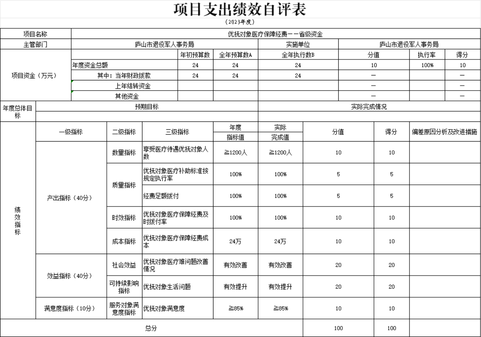 本单位优抚对象医疗保障经费项目支出绩效自评表”如下: