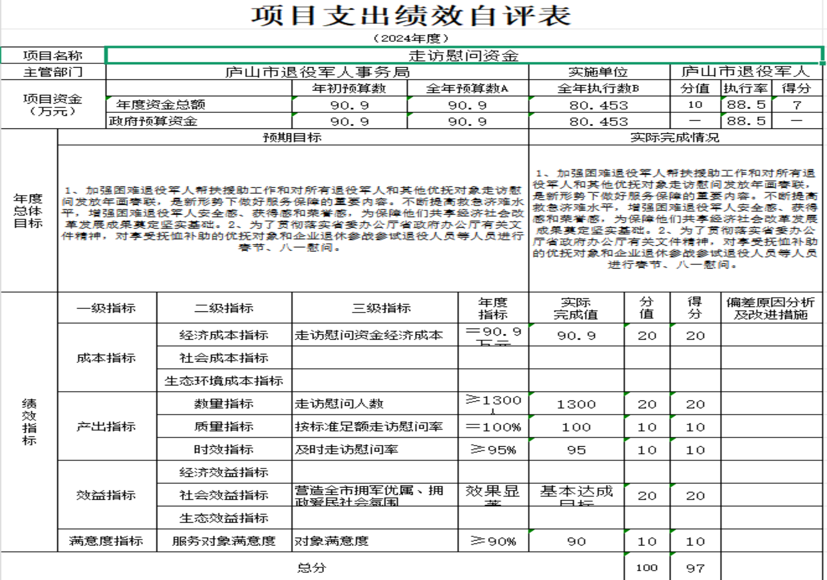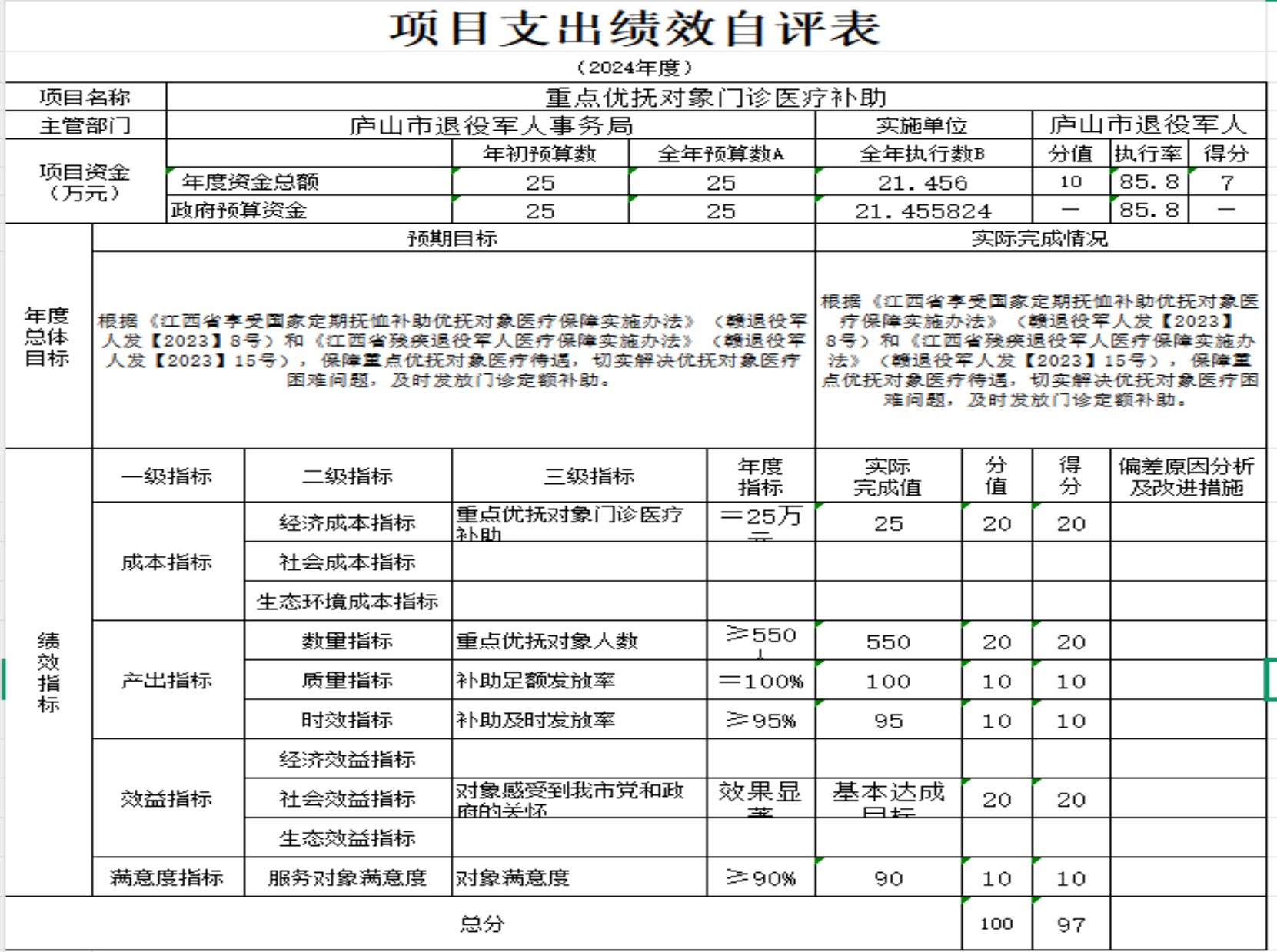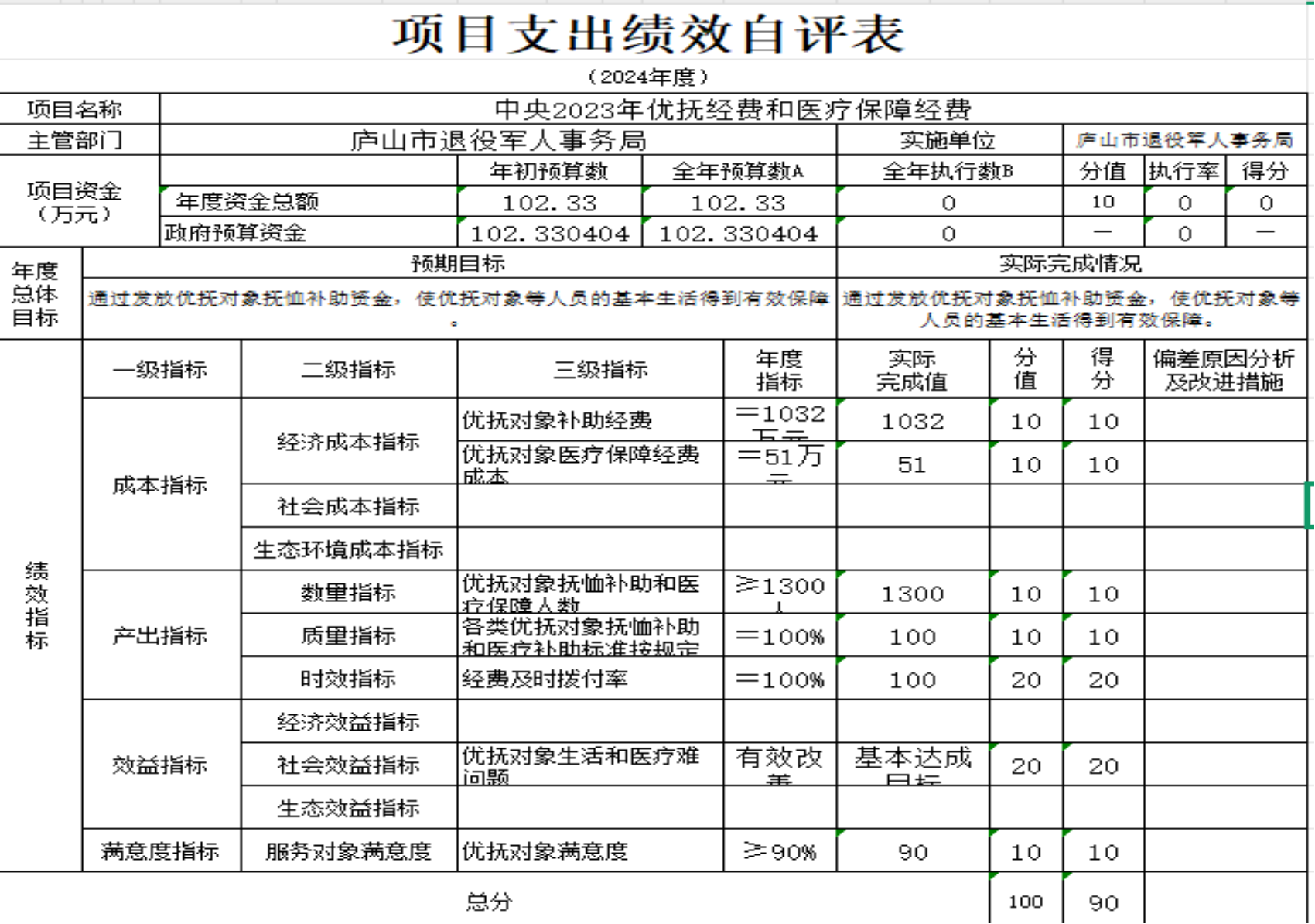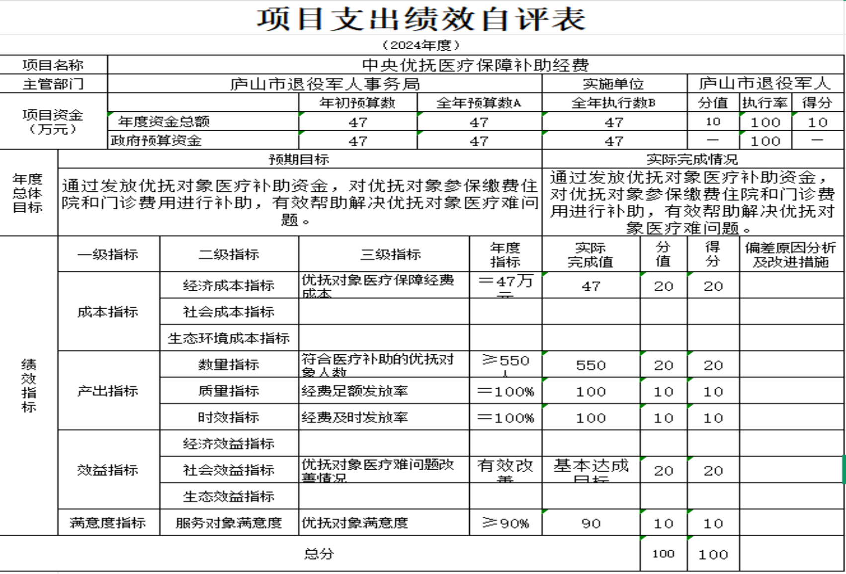 本单位“中央优抚医疗保障补助经费”“伤残军人护理费”等项目支出绩效自评结果如下: