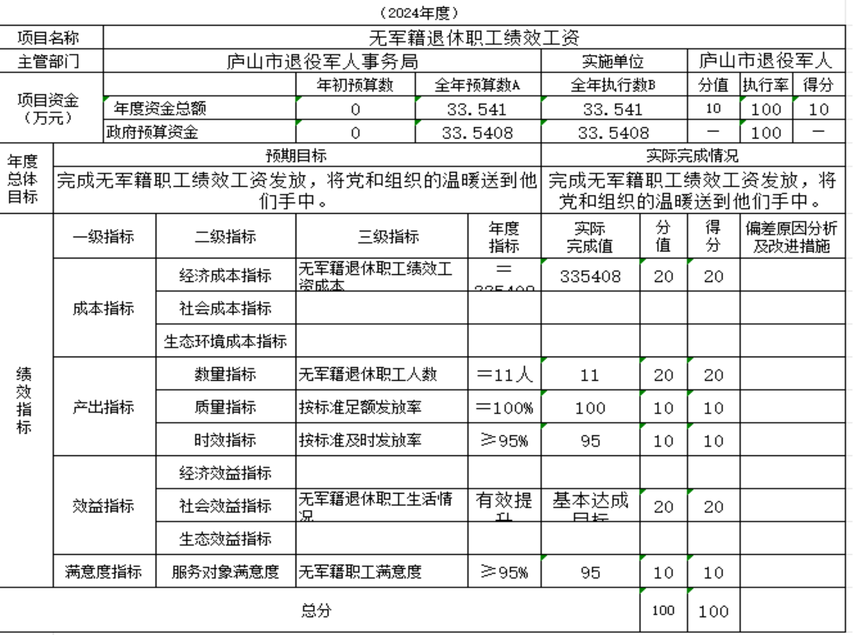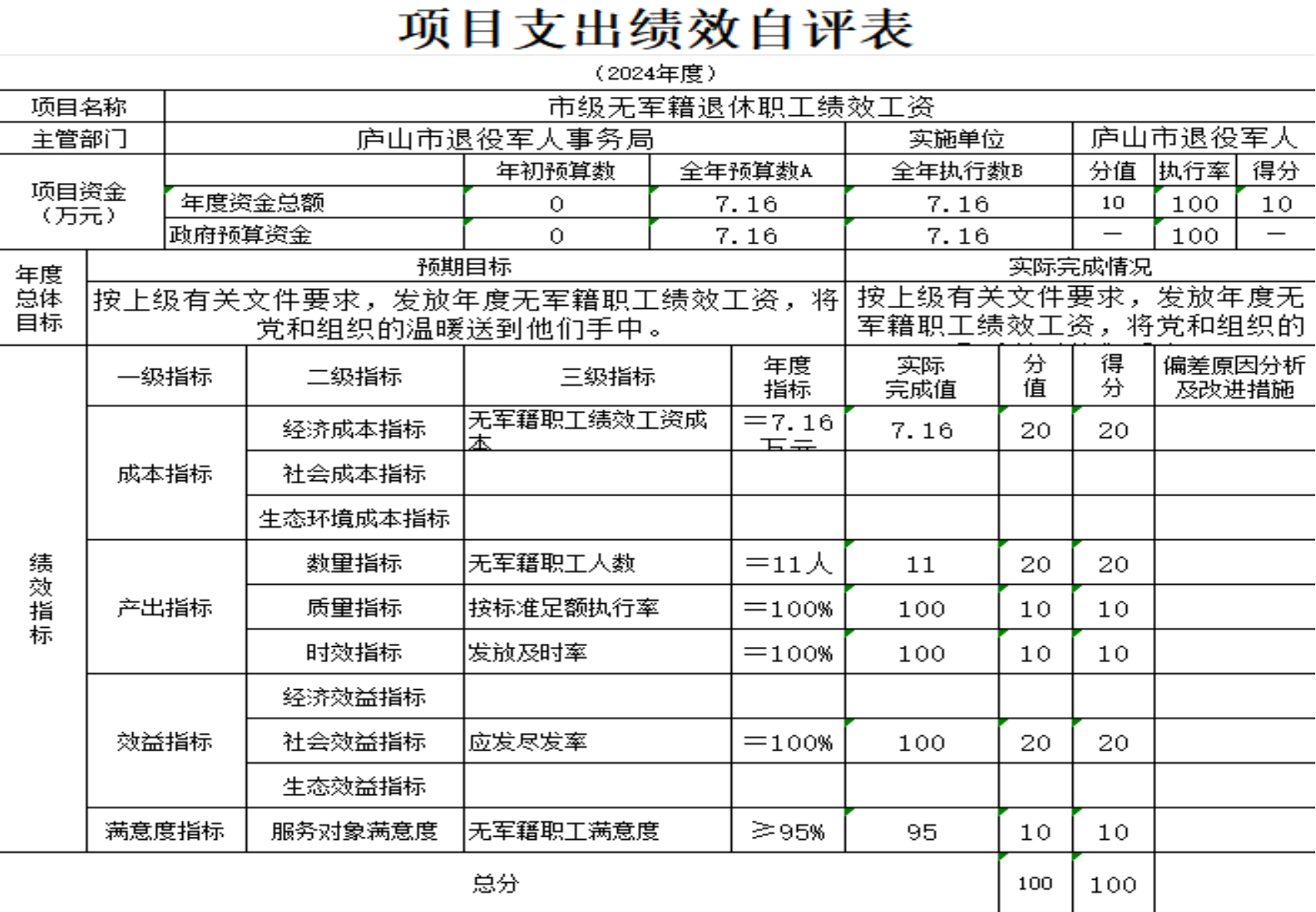 本单位无军籍职工绩效工资项目支出绩效自评表”如下: