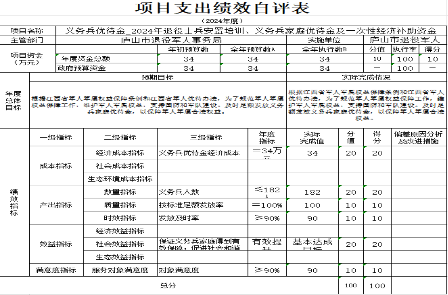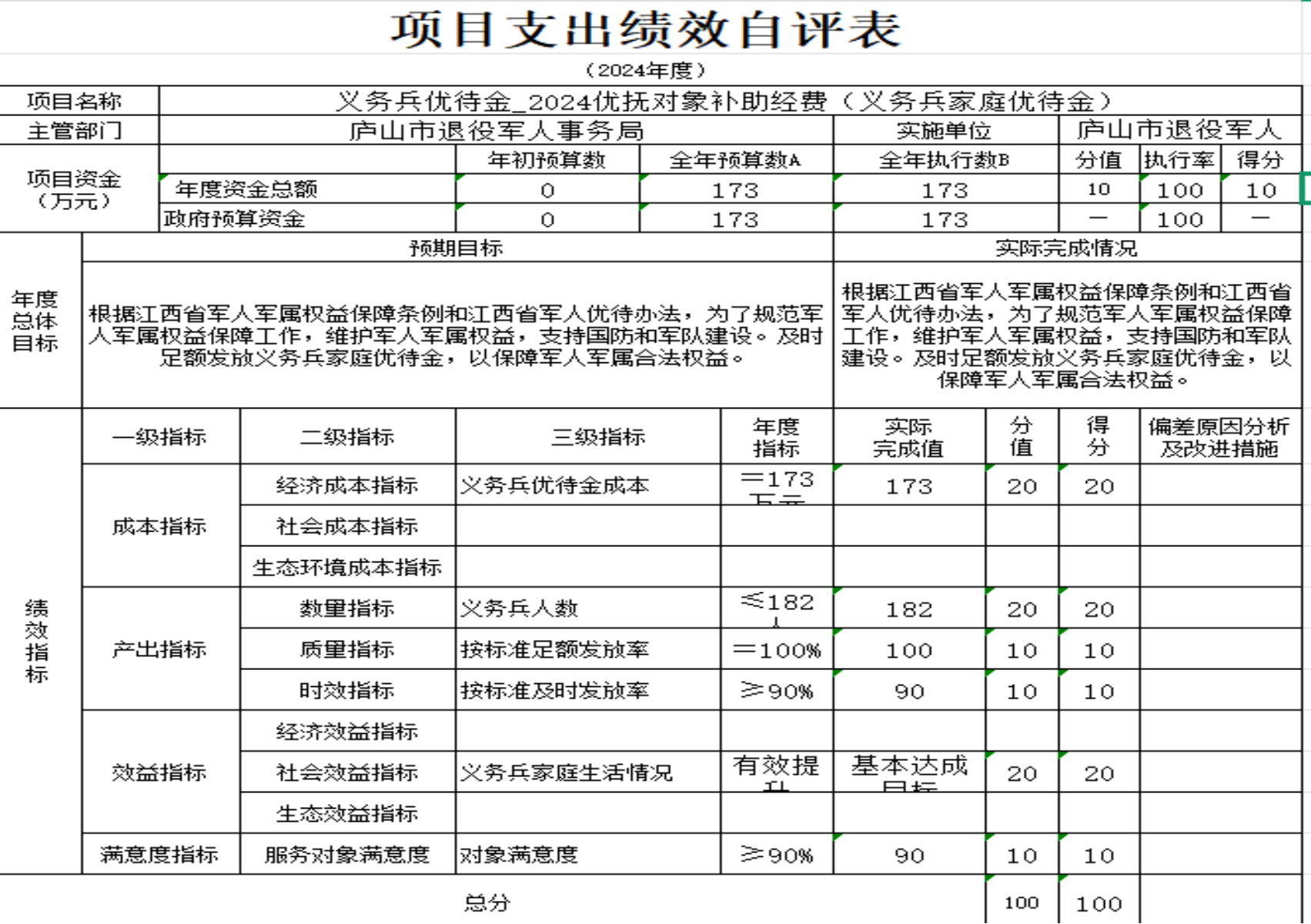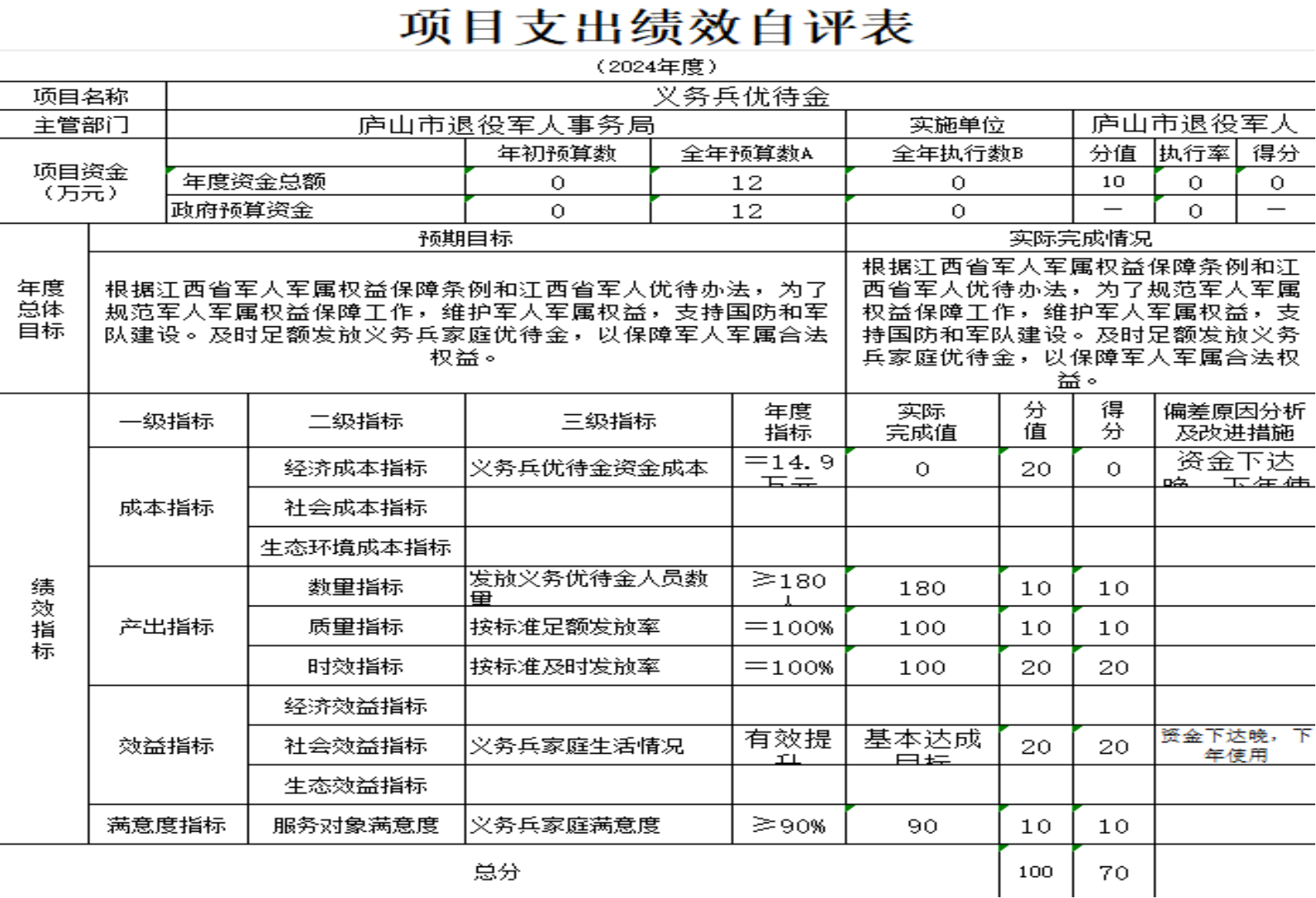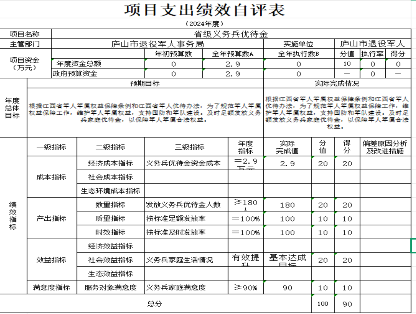 本单位省级义务兵优待金项目支出绩效自评表”如下: