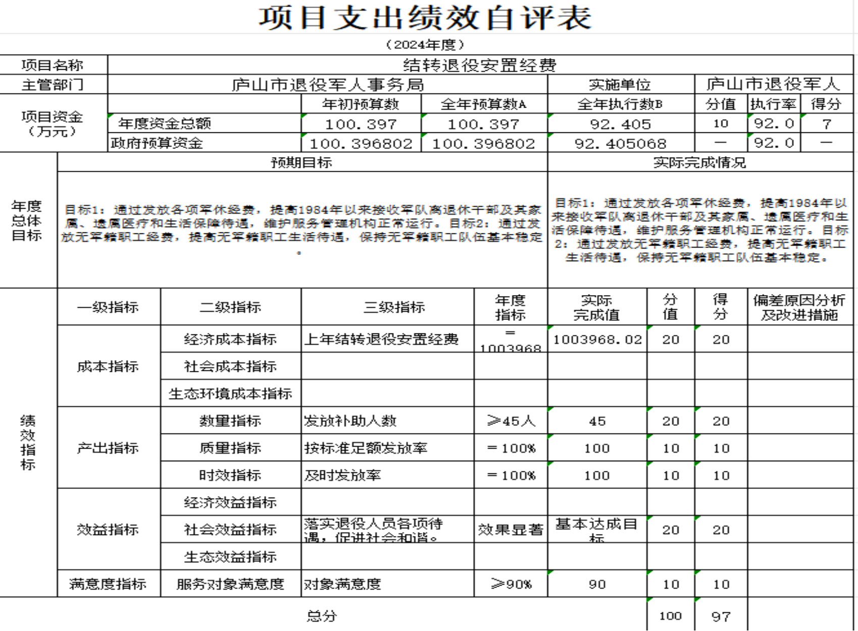本单位退役安置支出-退役安置项目支出绩效自评表”如下: