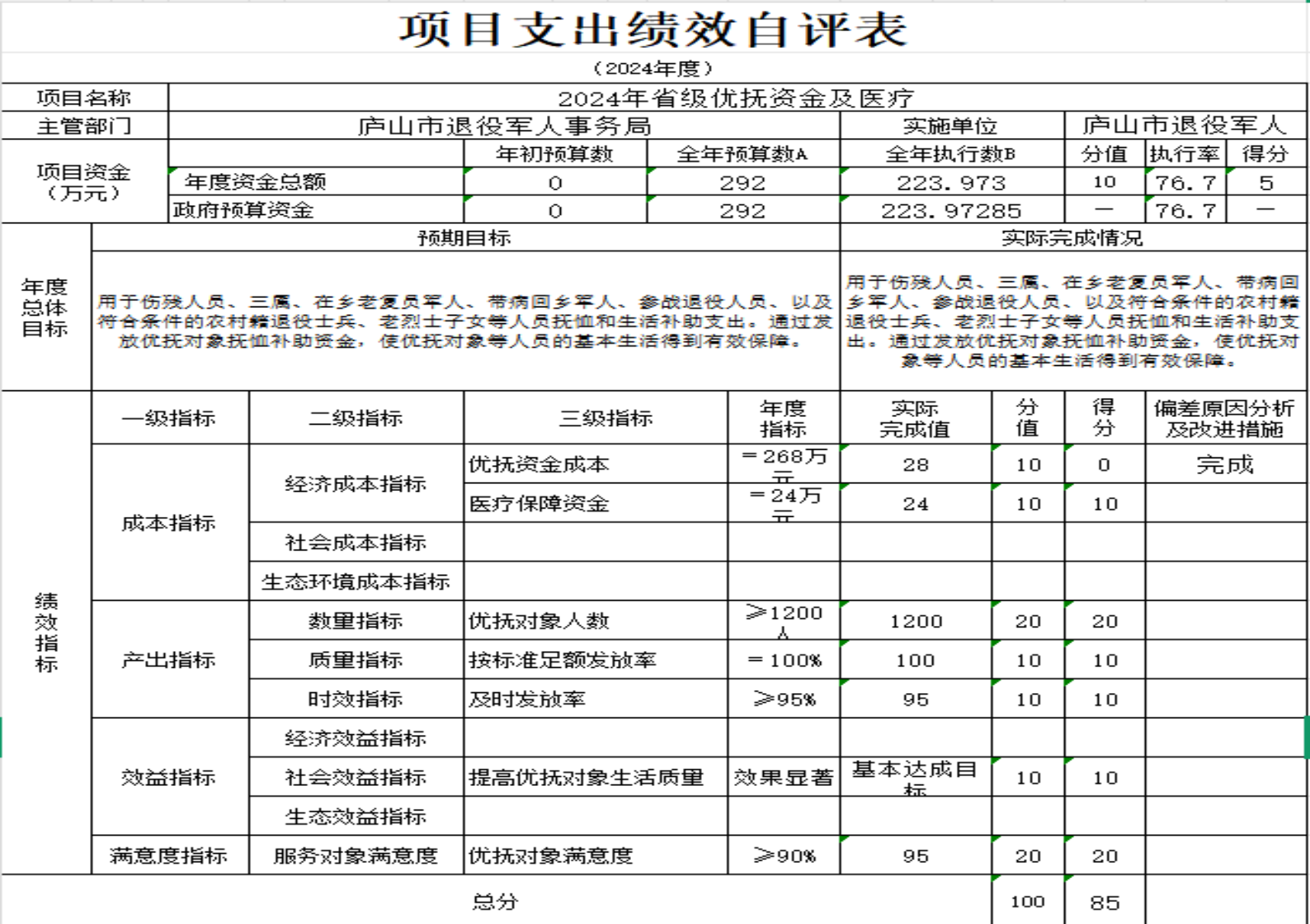 本单位省级优抚资金及医疗项目支出绩效自评表”如下: