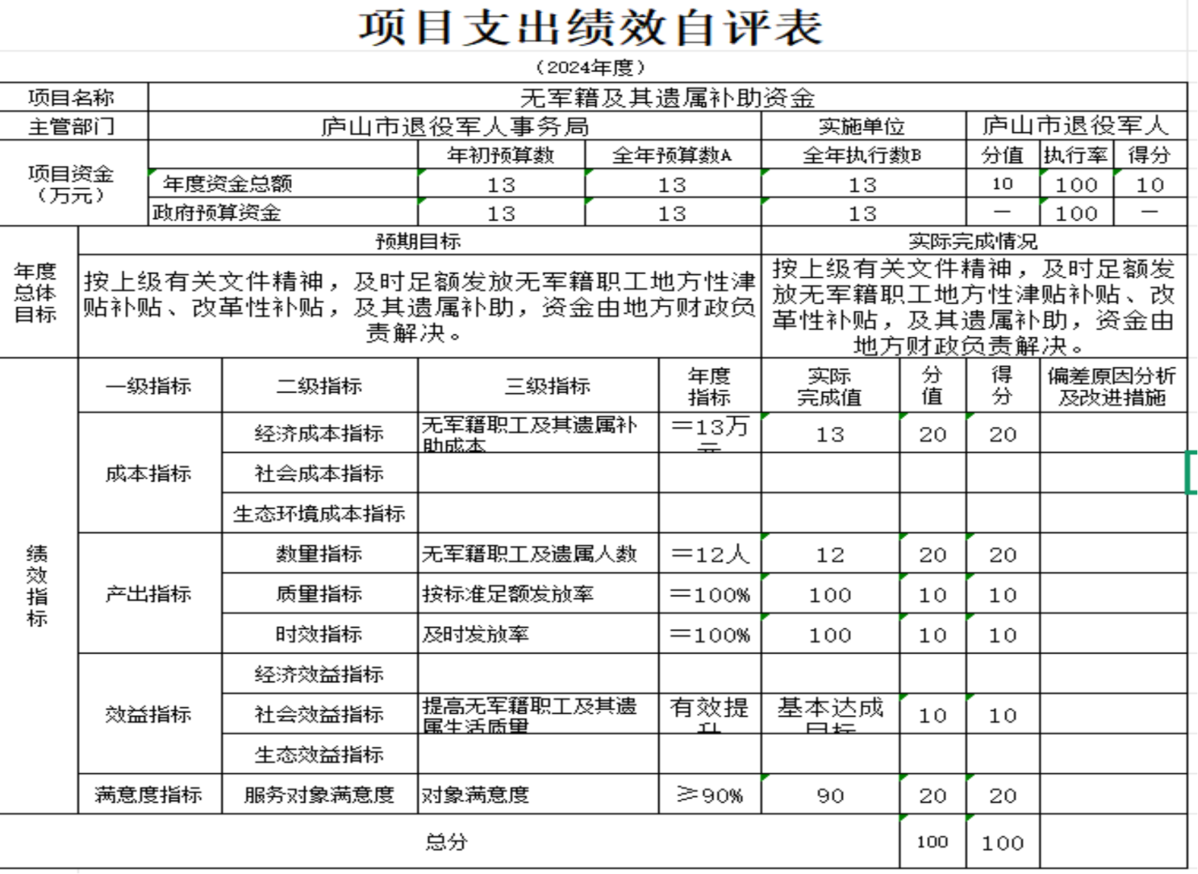 本单位无军籍及其遗属补助项目支出绩效自评表”如下: