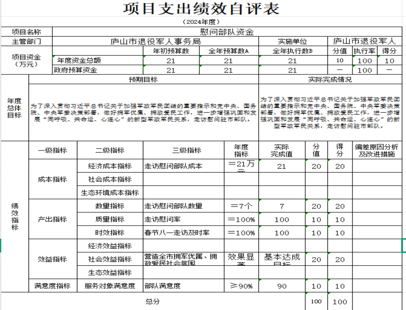 本单位慰问部队资金项目支出绩效自评表”如下: