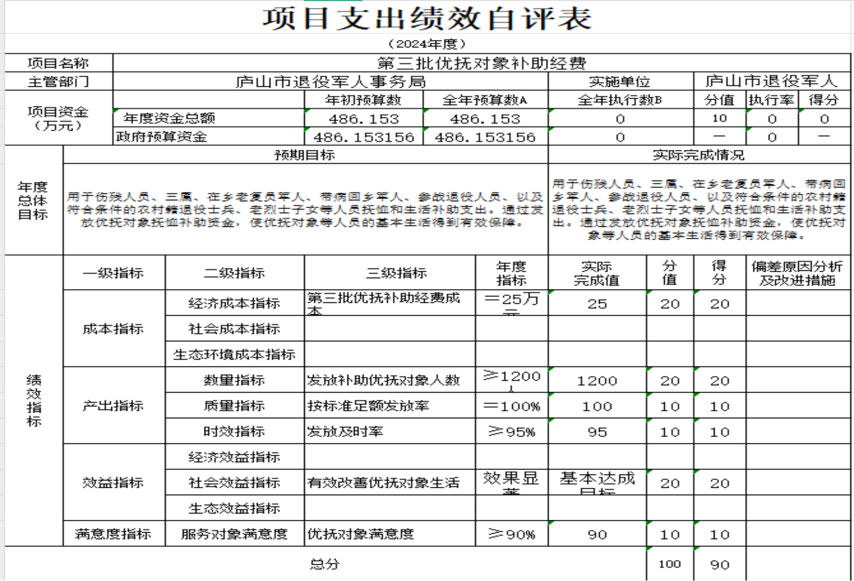 本单位第三批优抚对象补助经费项目支出绩效自评表”如下: