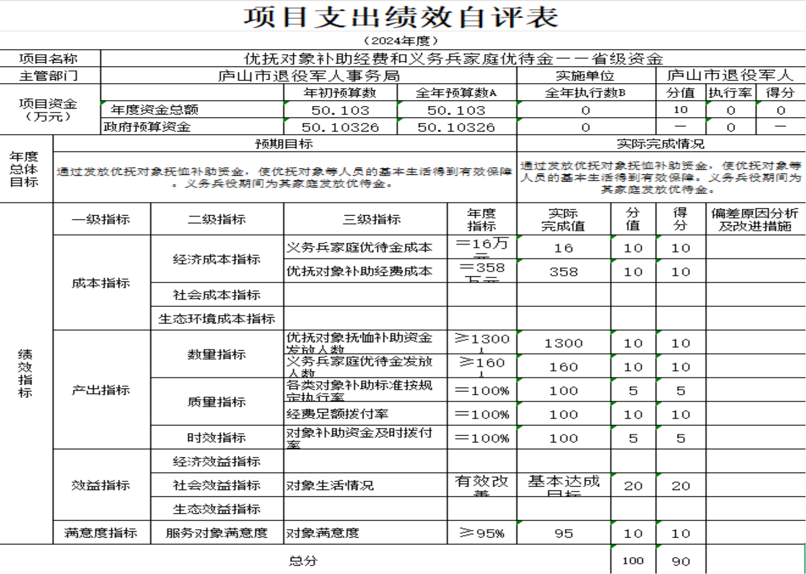 本单位省级优抚对象补助经费和义务兵家庭优待金项目支出绩效自评表”如下:
