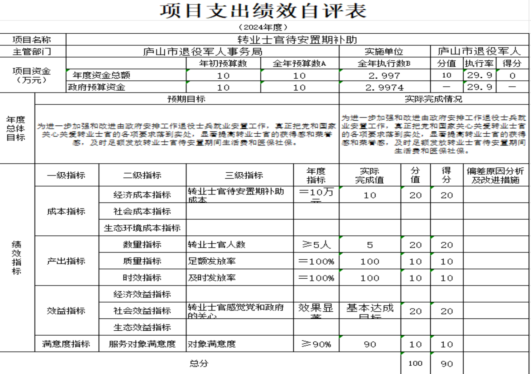 本单位转业安置待安置期补助项目支出绩效自评表”如下: