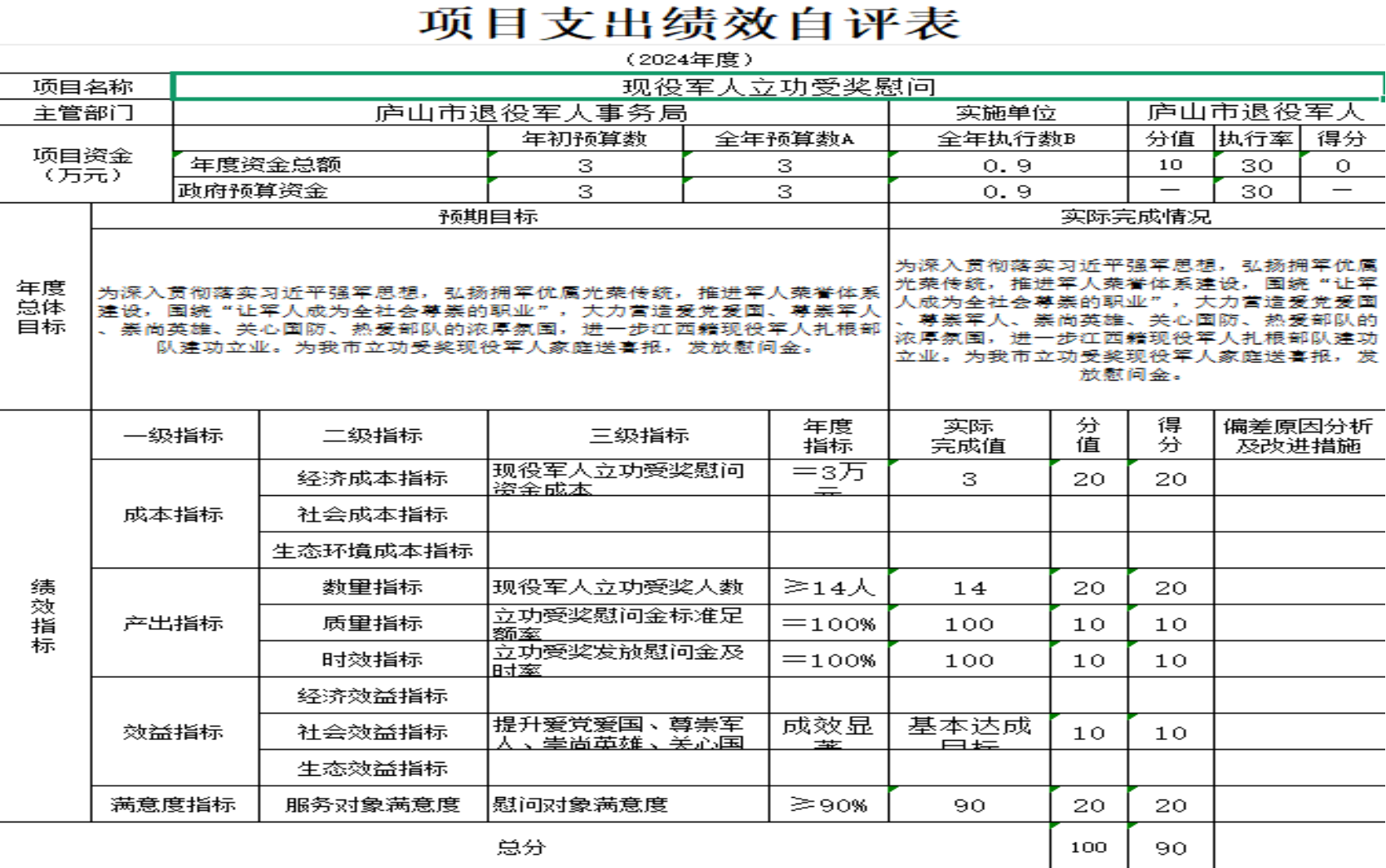 本单位现役军人立功受奖项目支出绩效自评表”如下: