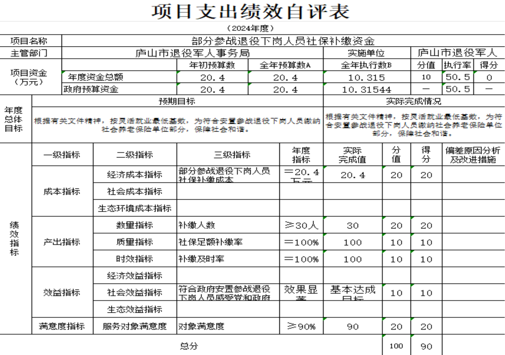 本单位部分参战退役下岗人员社保补缴项目支出绩效自评表”如下: