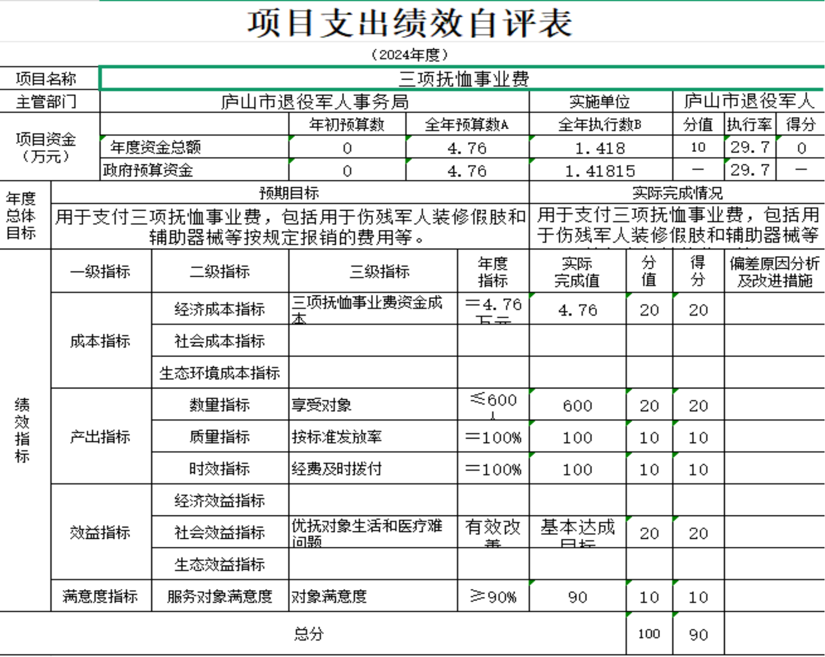 本单位三项抚恤事业费项目支出绩效自评表”如下: