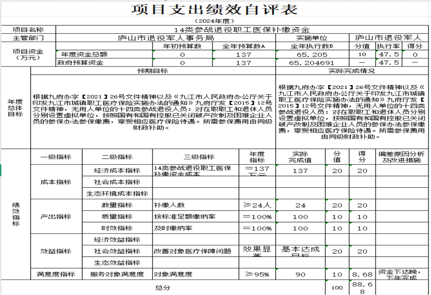 本单位14类参战退役职工医保补缴资金项目支出绩效自评表”如下:
