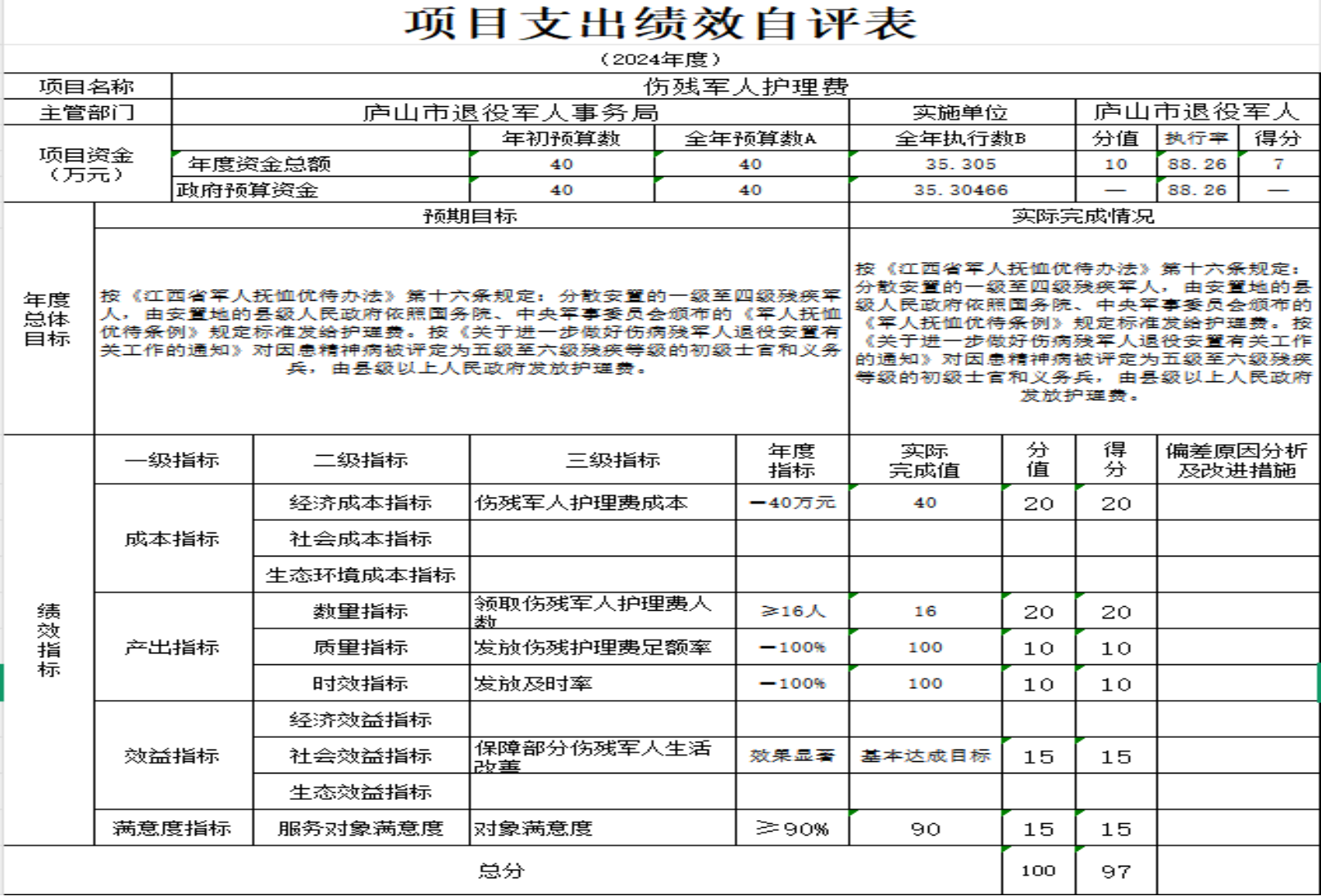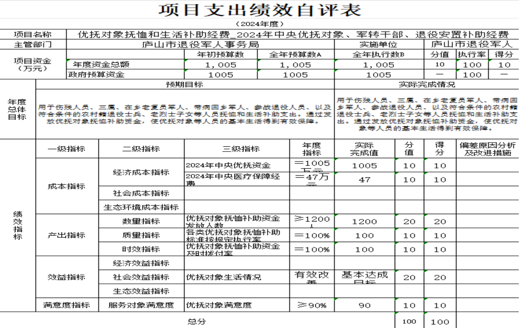 2.绩效评价对象和范围:本次绩效评价对象为2024年中央2024年优抚对象和医疗保障经费项目预算资金使用效益及具体实施情况,涵盖庐山市整个区域,结合资金划拨程序、财务管理规范及绩效目标要求等,评价范围包括项目决策情况、项目过程情况及项目产出、效益情况。