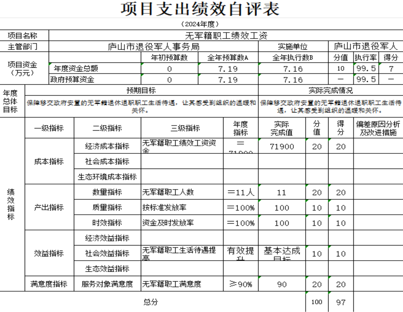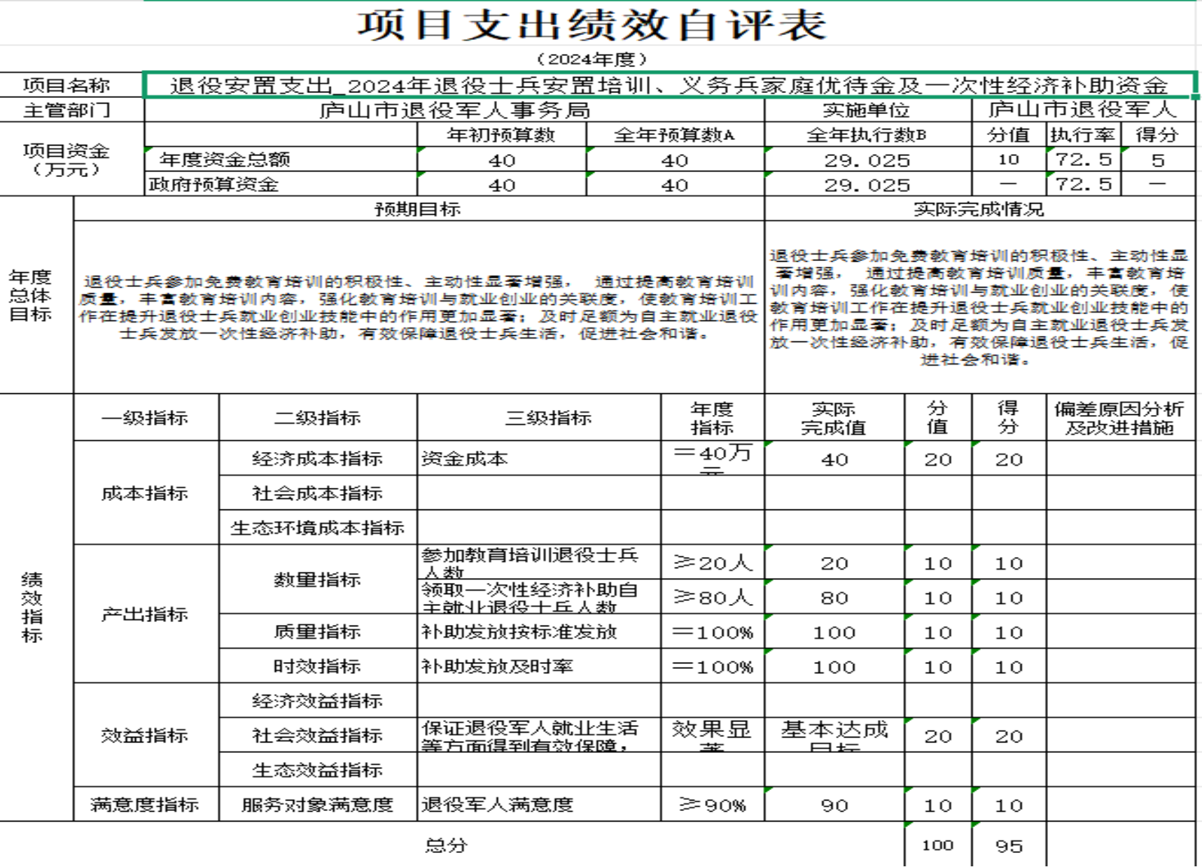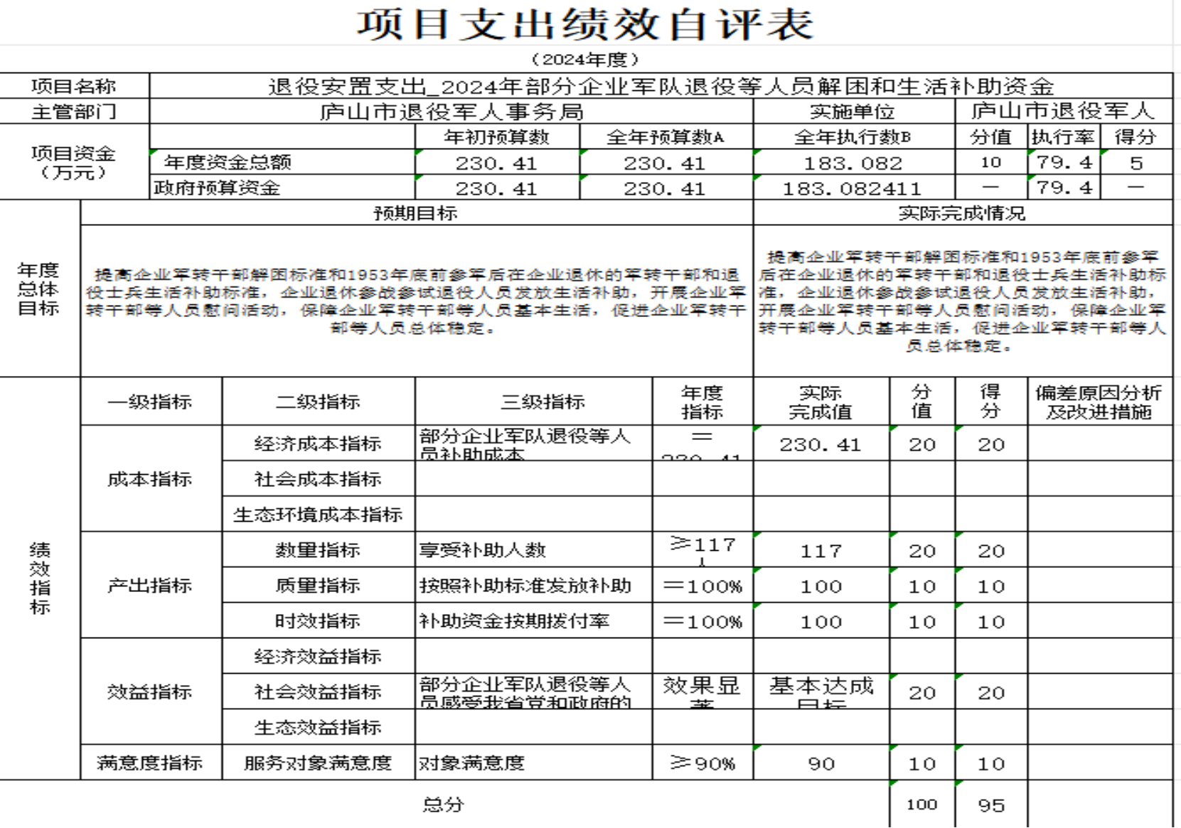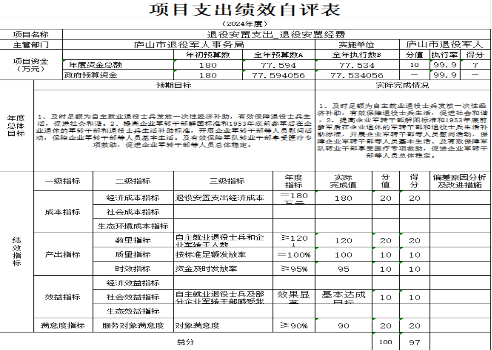 本部门退役安置支出-退役安置项目支出绩效自评表”如下: