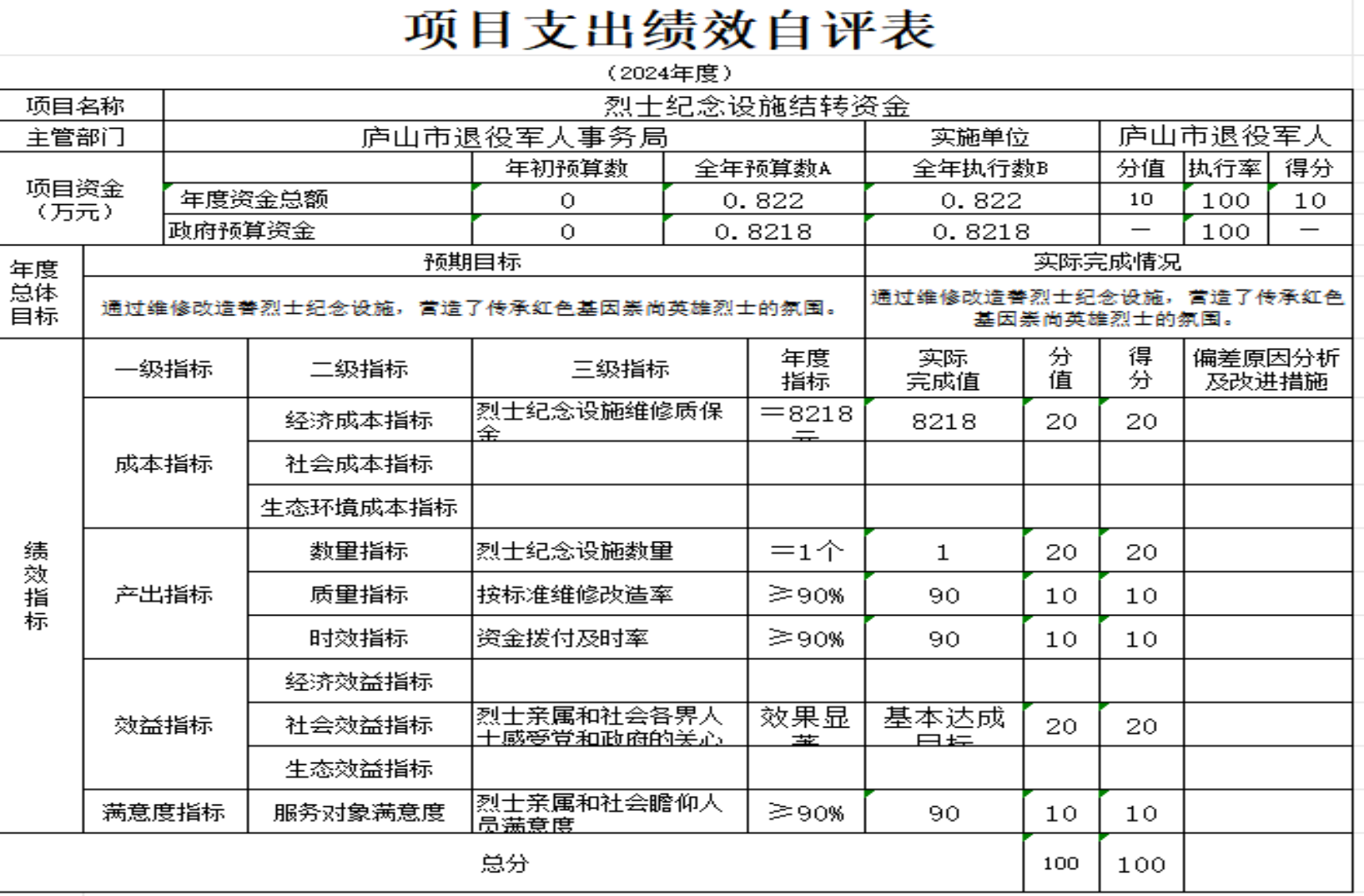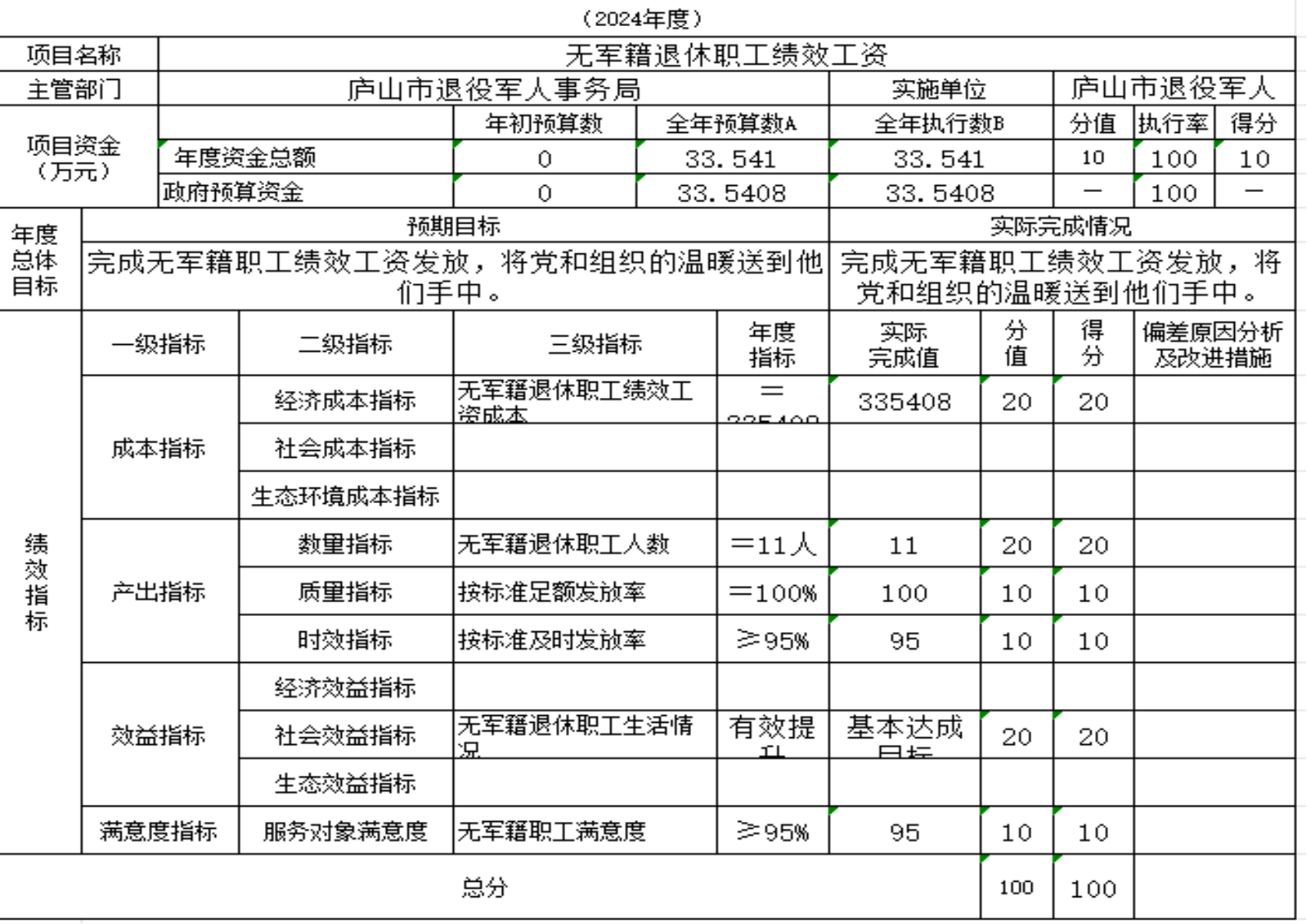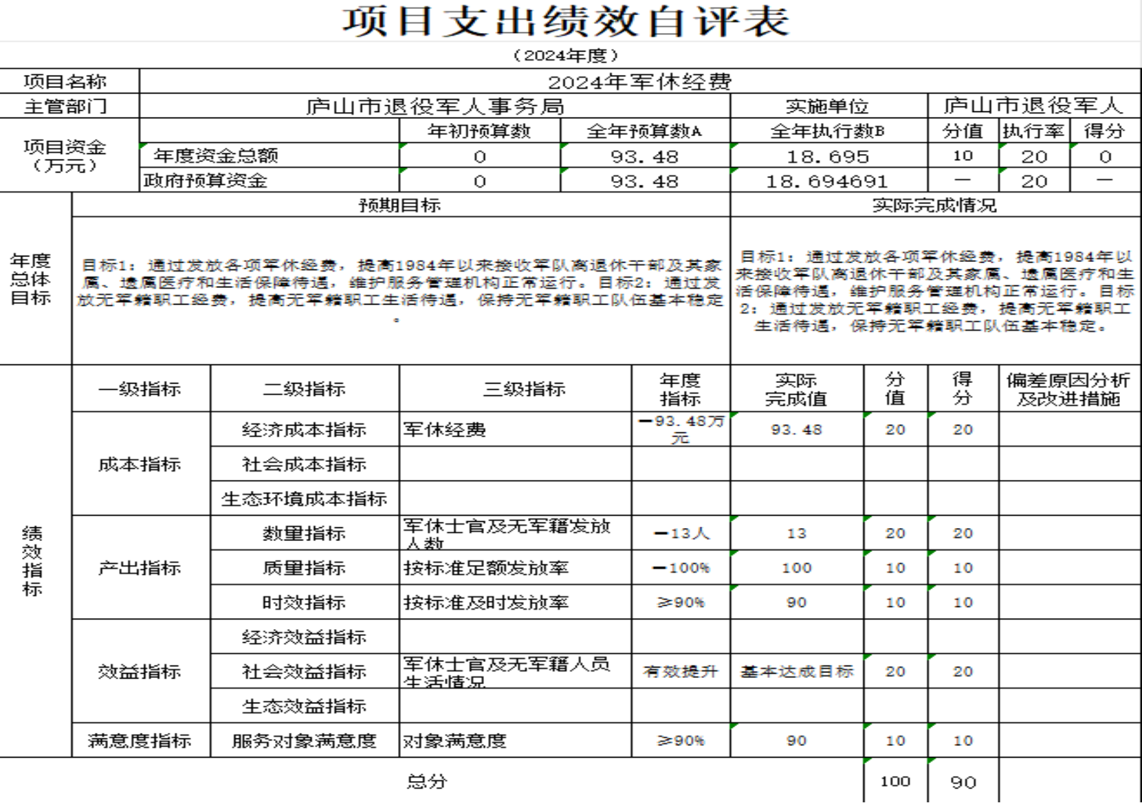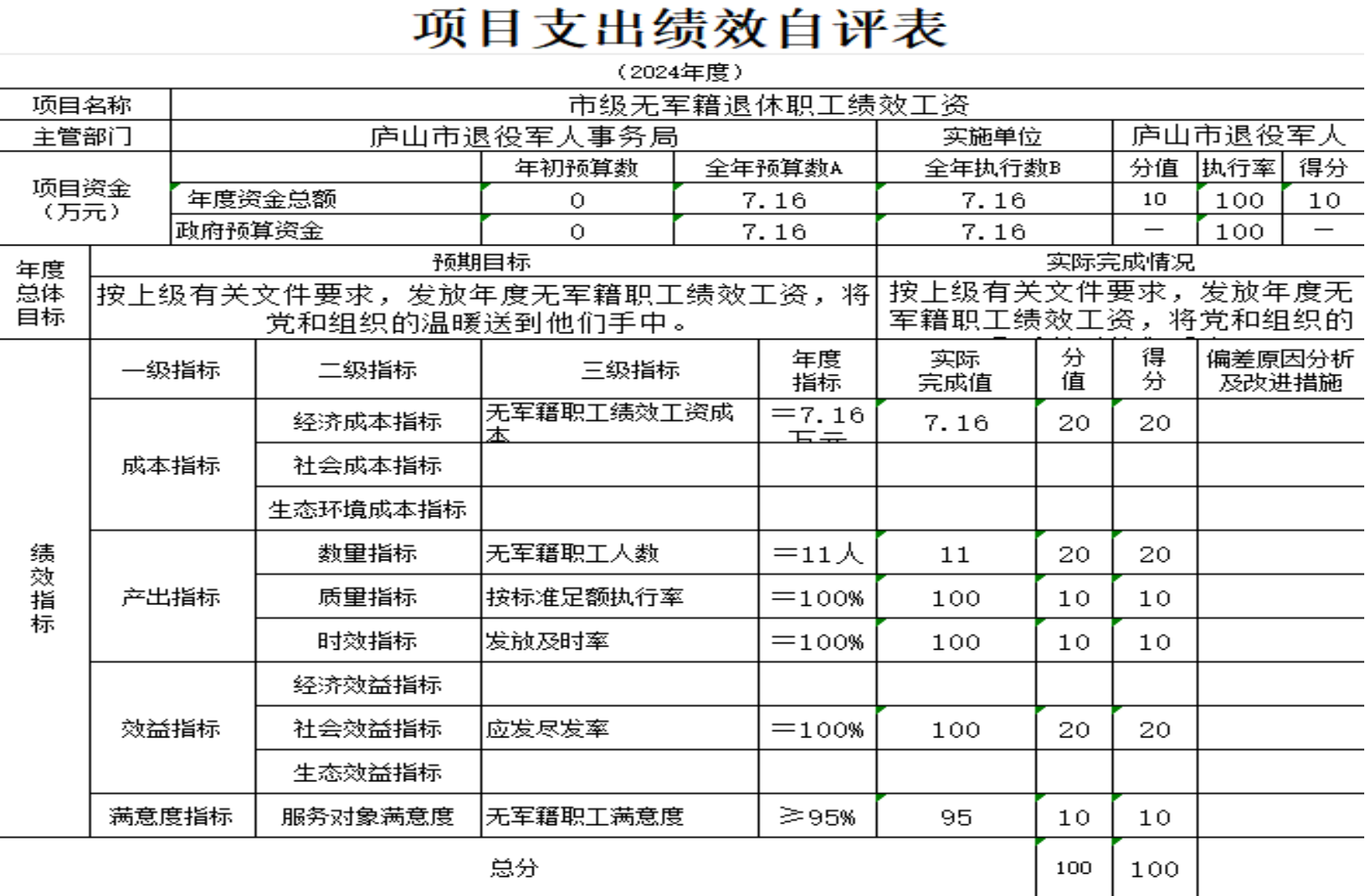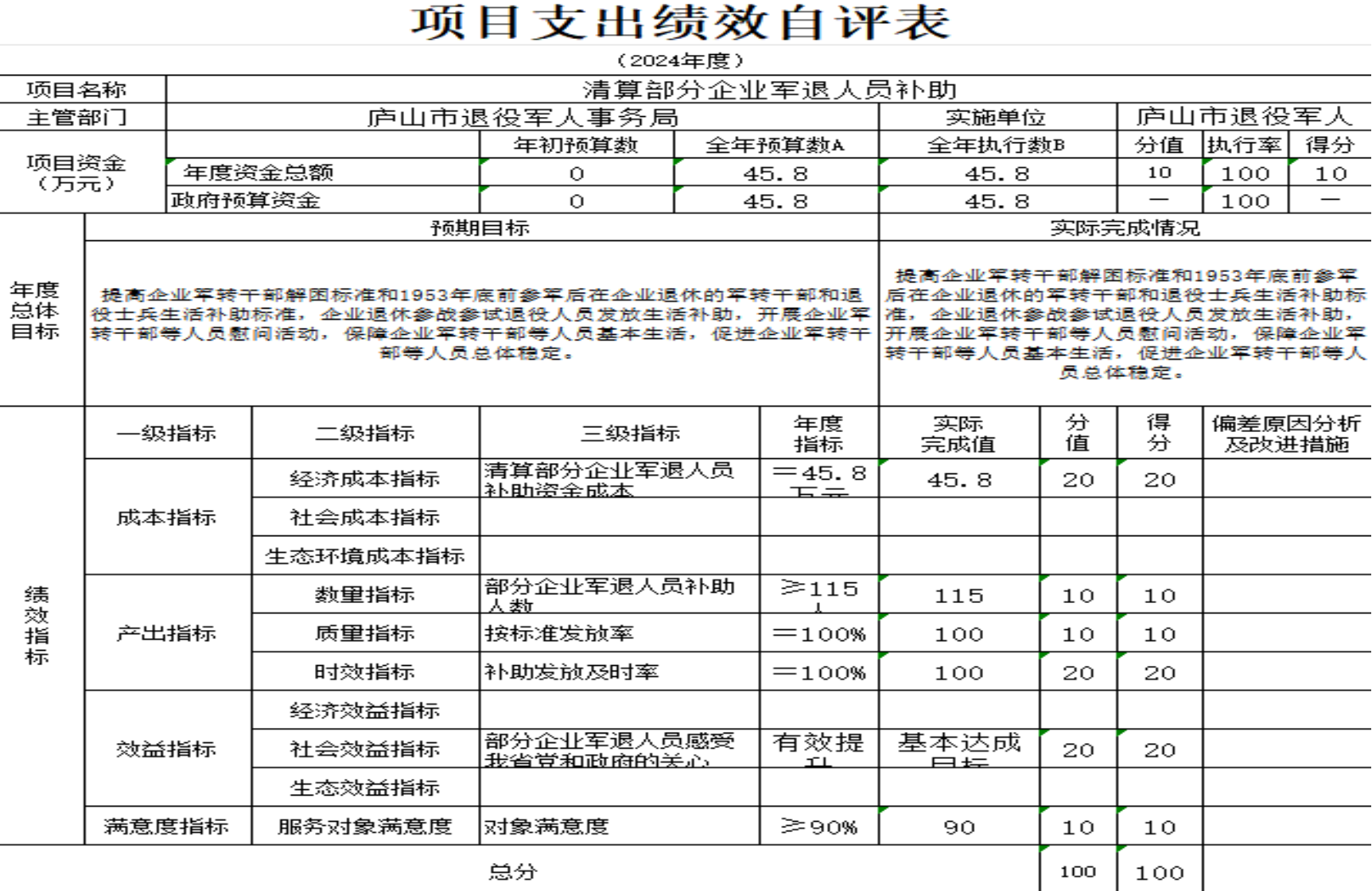 本部门退役安置支出-退役安置项目支出绩效自评表”如下: