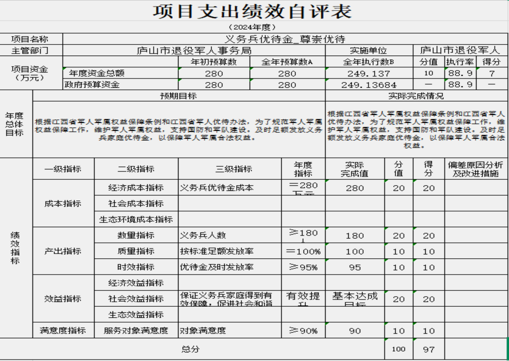 本部门义务兵优待金-尊崇优待项目支出绩效自评表”如下: