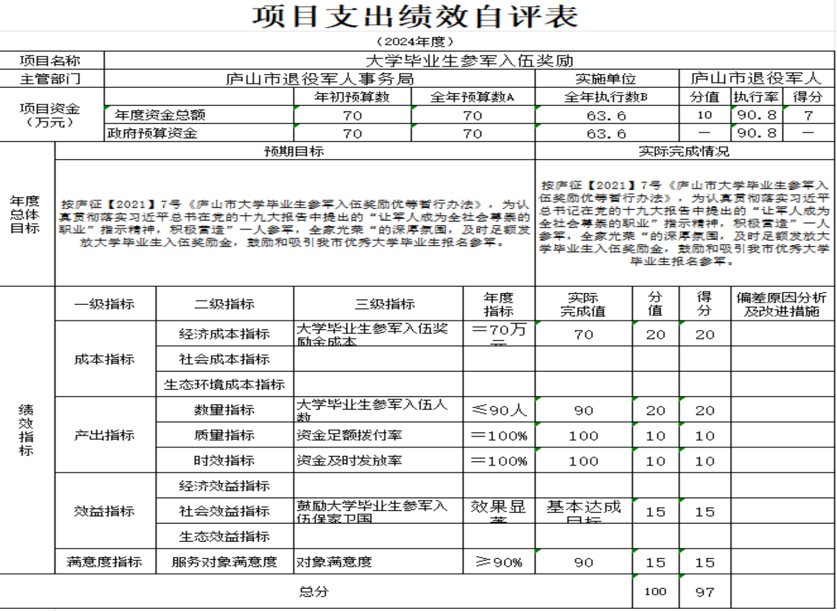 本部门大学毕业生参军入伍项目支出绩效自评表”如下: