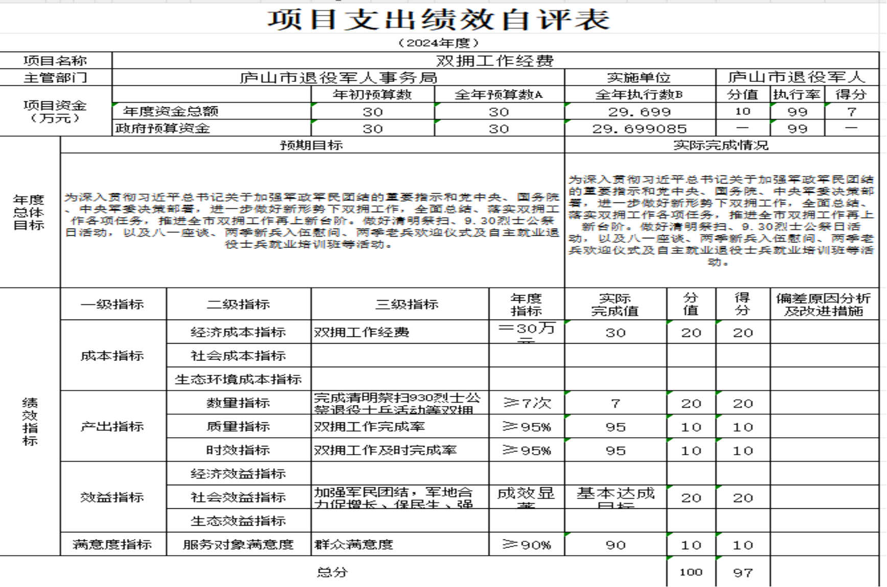本部门双拥工作经费项目支出绩效自评表”如下: