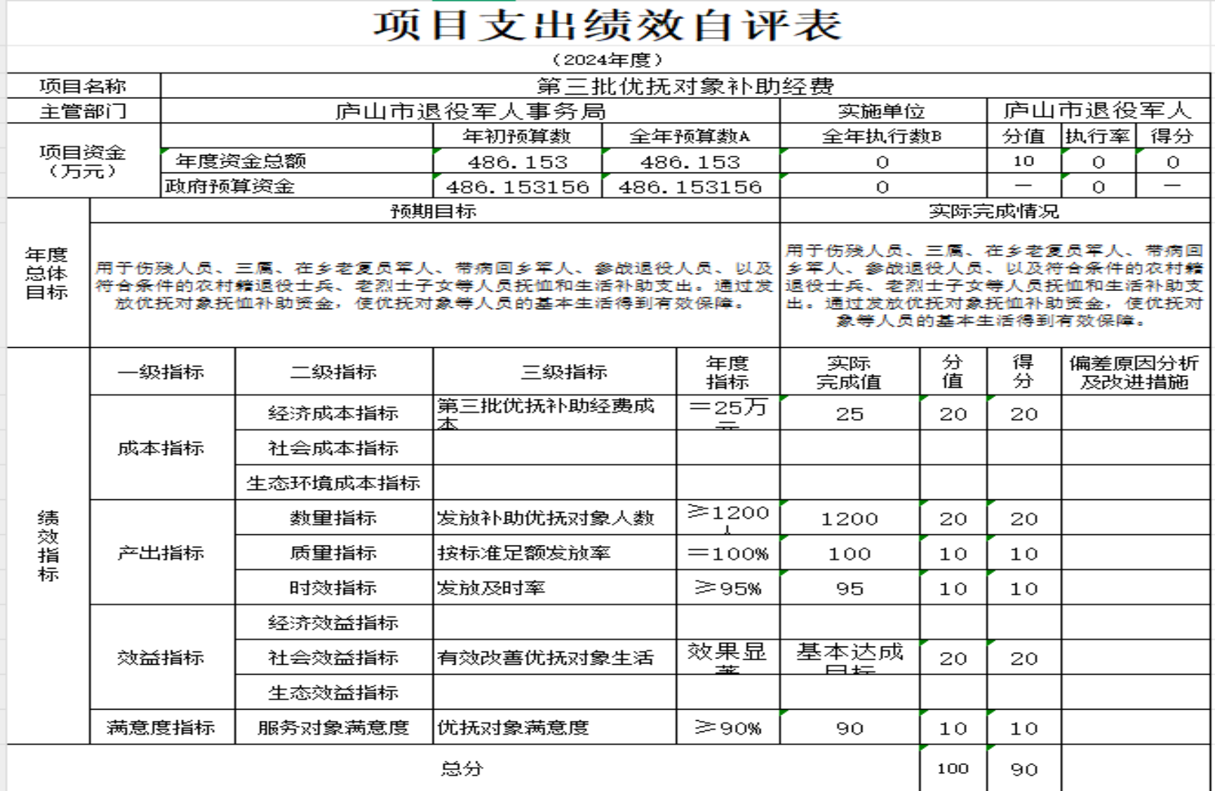 本部门第三批优抚对象补助经费项目支出绩效自评表”如下: