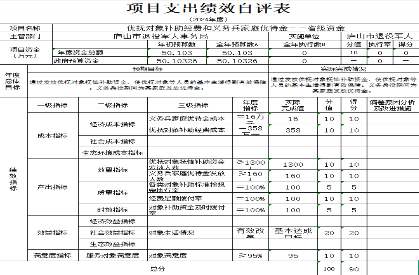 本部门省级优抚对象补助经费和义务兵家庭优待金项目支出绩效自评表”如下: