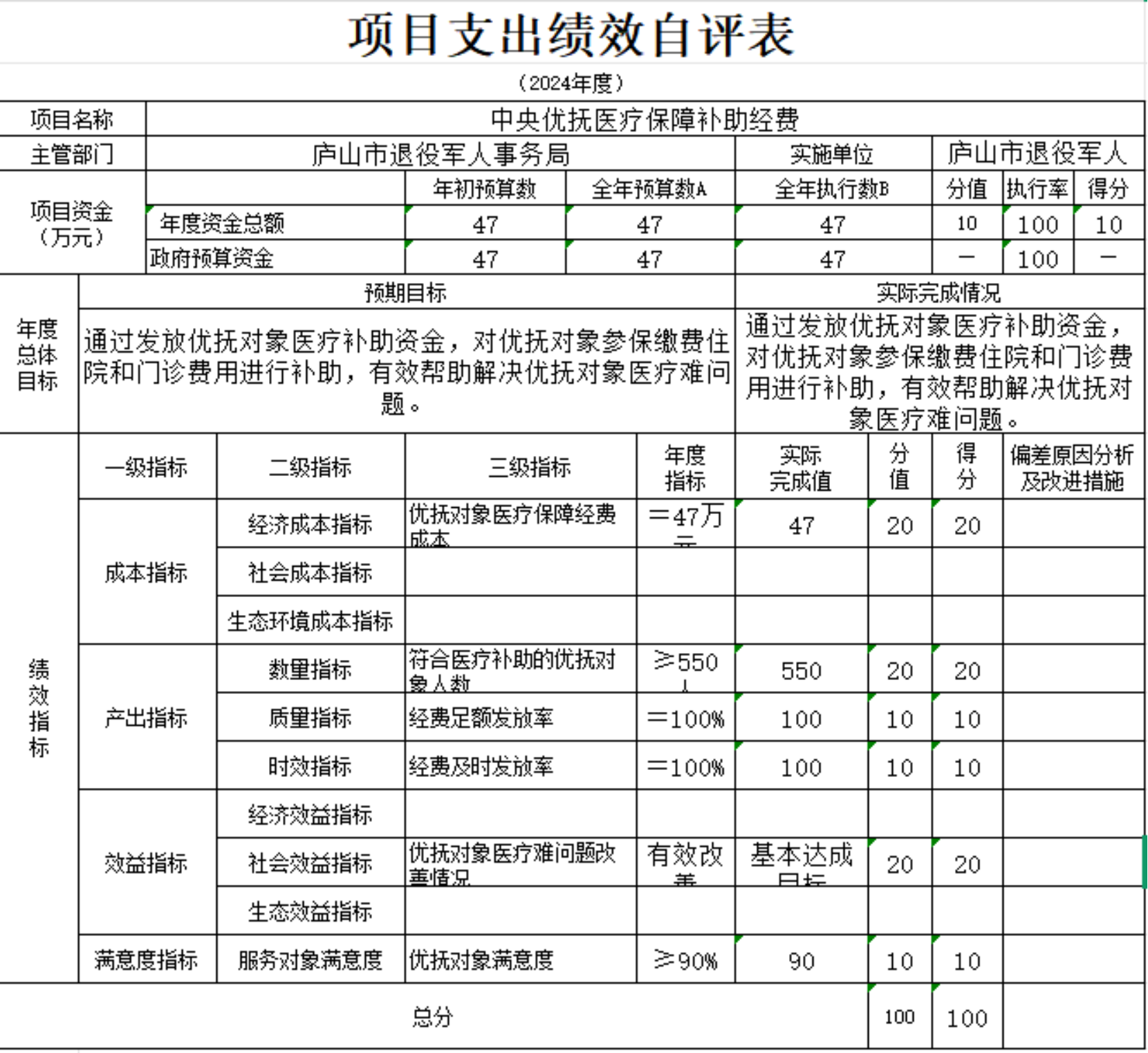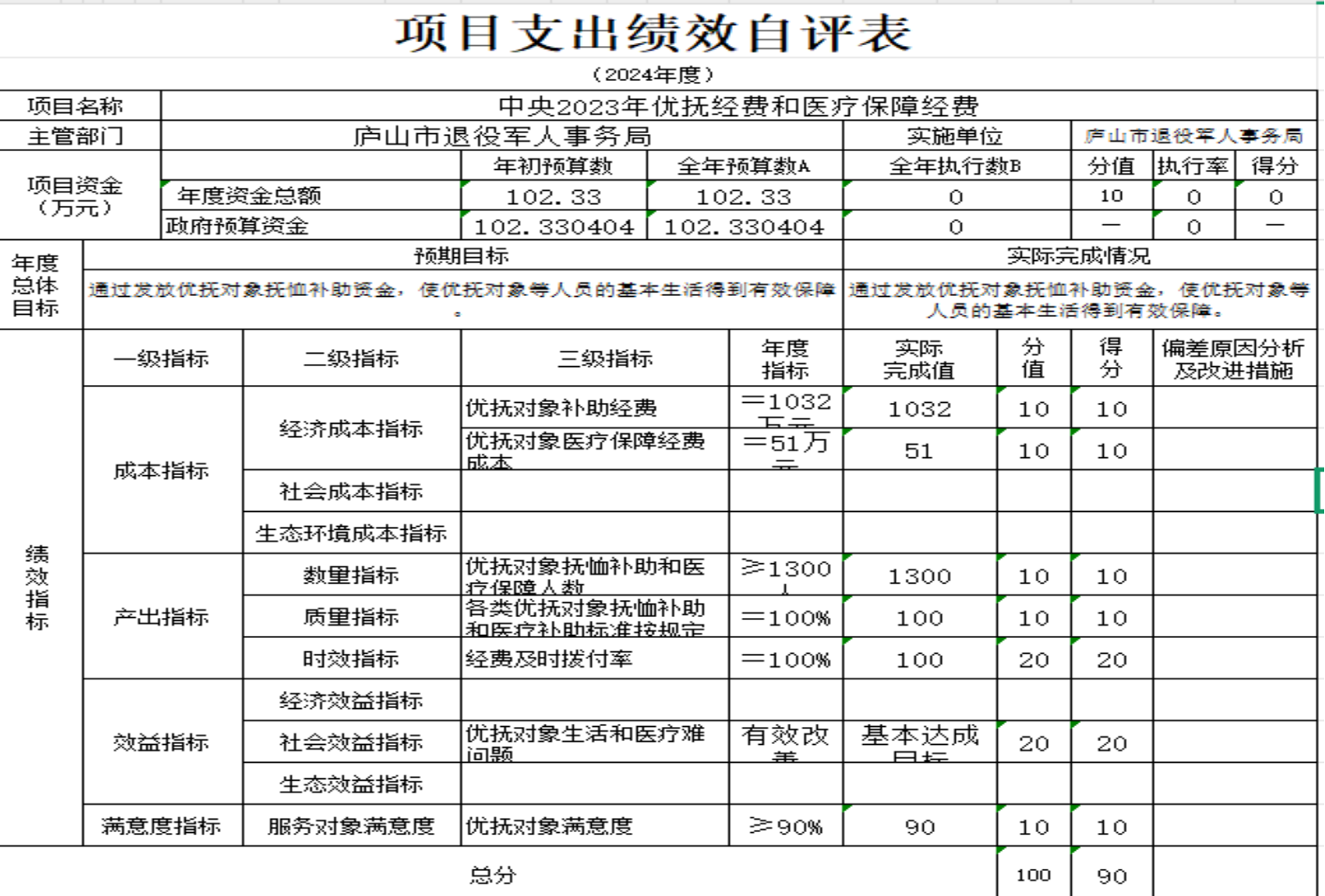 本部门中央优抚经费和医疗保障项目支出绩效自评表”如下: