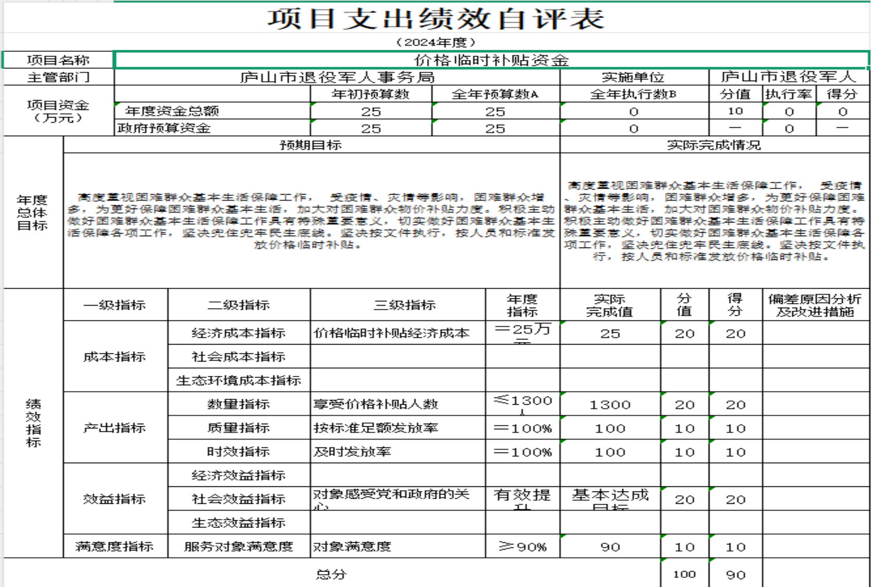 本部门价格临时补贴资金项目支出绩效自评表”如下: