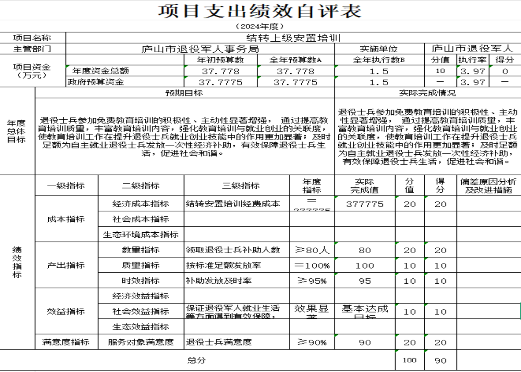本部门退役士兵安置培训项目支出绩效自评表”如下: