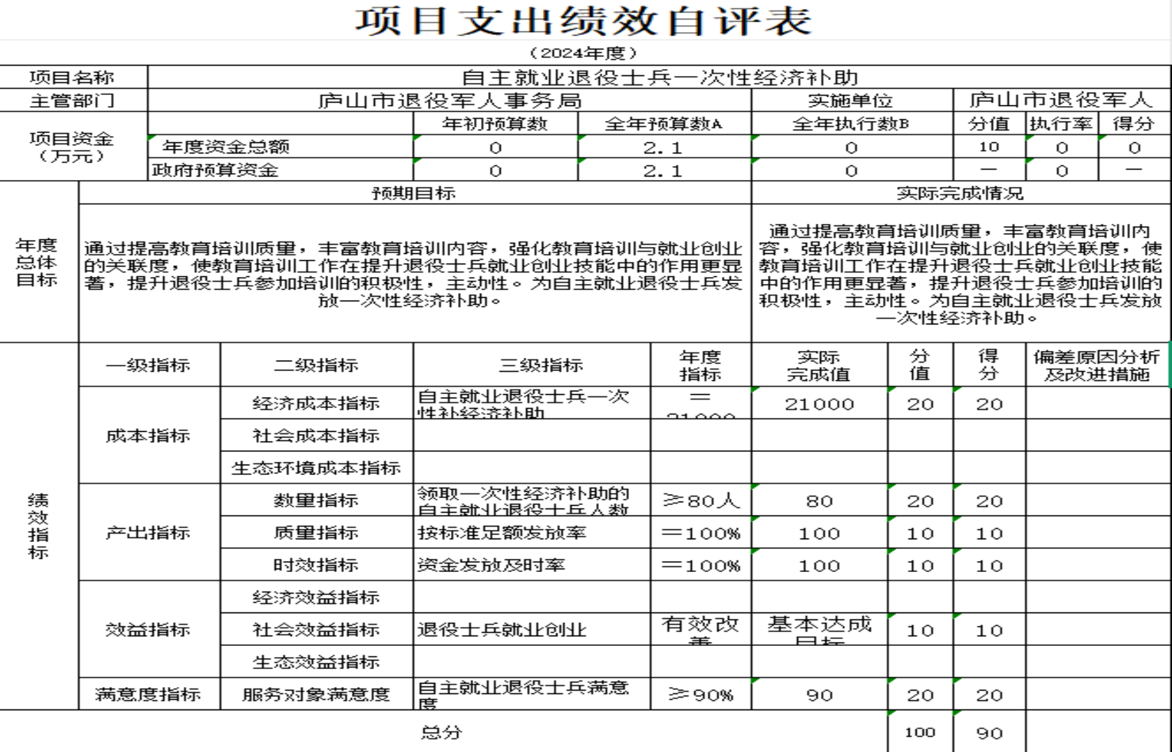 本部门自主就业退役士兵一次性经济补助项目支出绩效自评表”如下:
