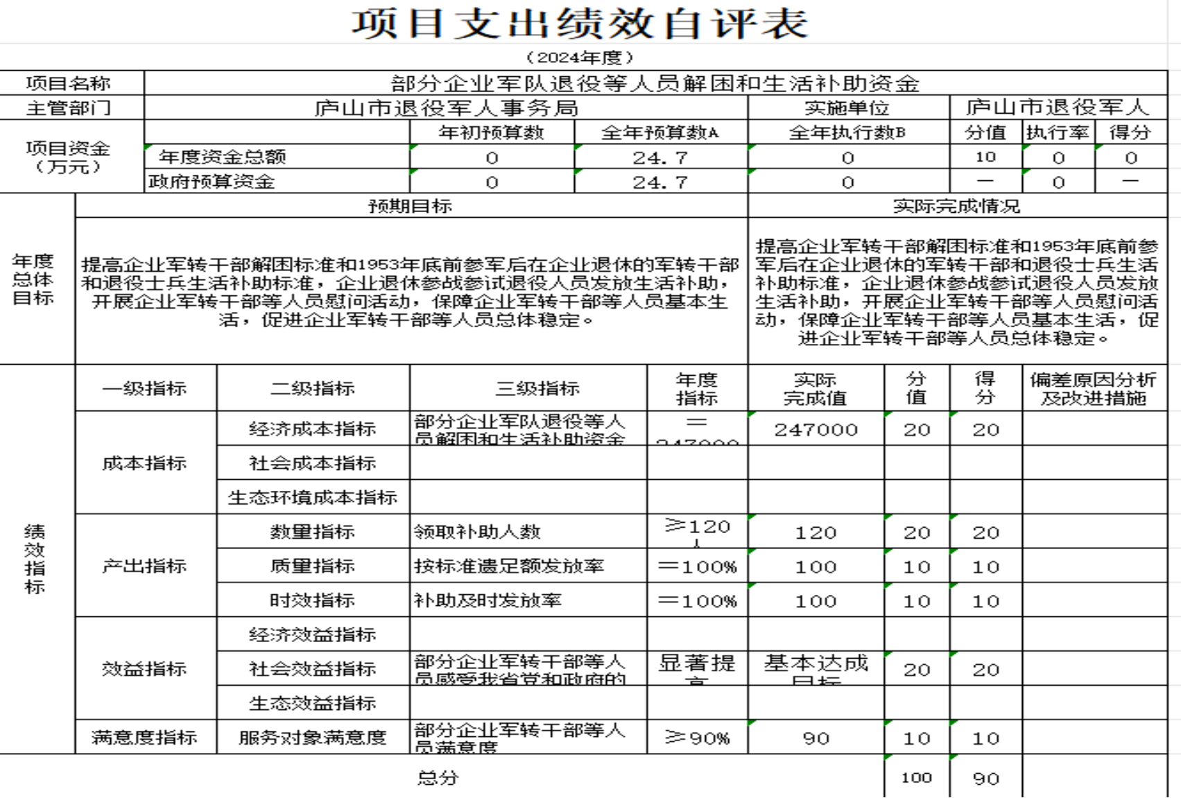 本部门企业军队人员解困和生活补助资金项目支出绩效自评表”如下: