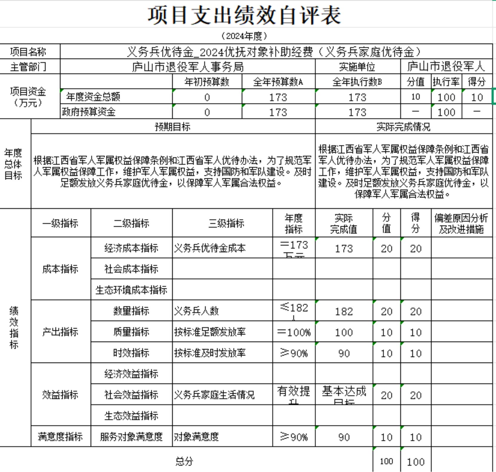 2.绩效评价对象和范围:本次绩效评价对象为2024年义务兵家庭优待金资金项目预算资金使用效益及具体实施情况,涵盖庐山市整个区域,结合资金划拨程序、财务管理规范及绩效目标要求等,评价范围包括项目决策情况、项目过程情况及项目产出、效益情况。