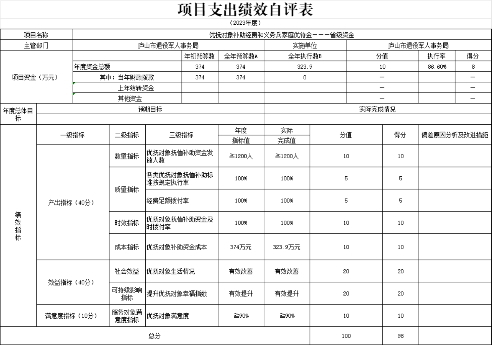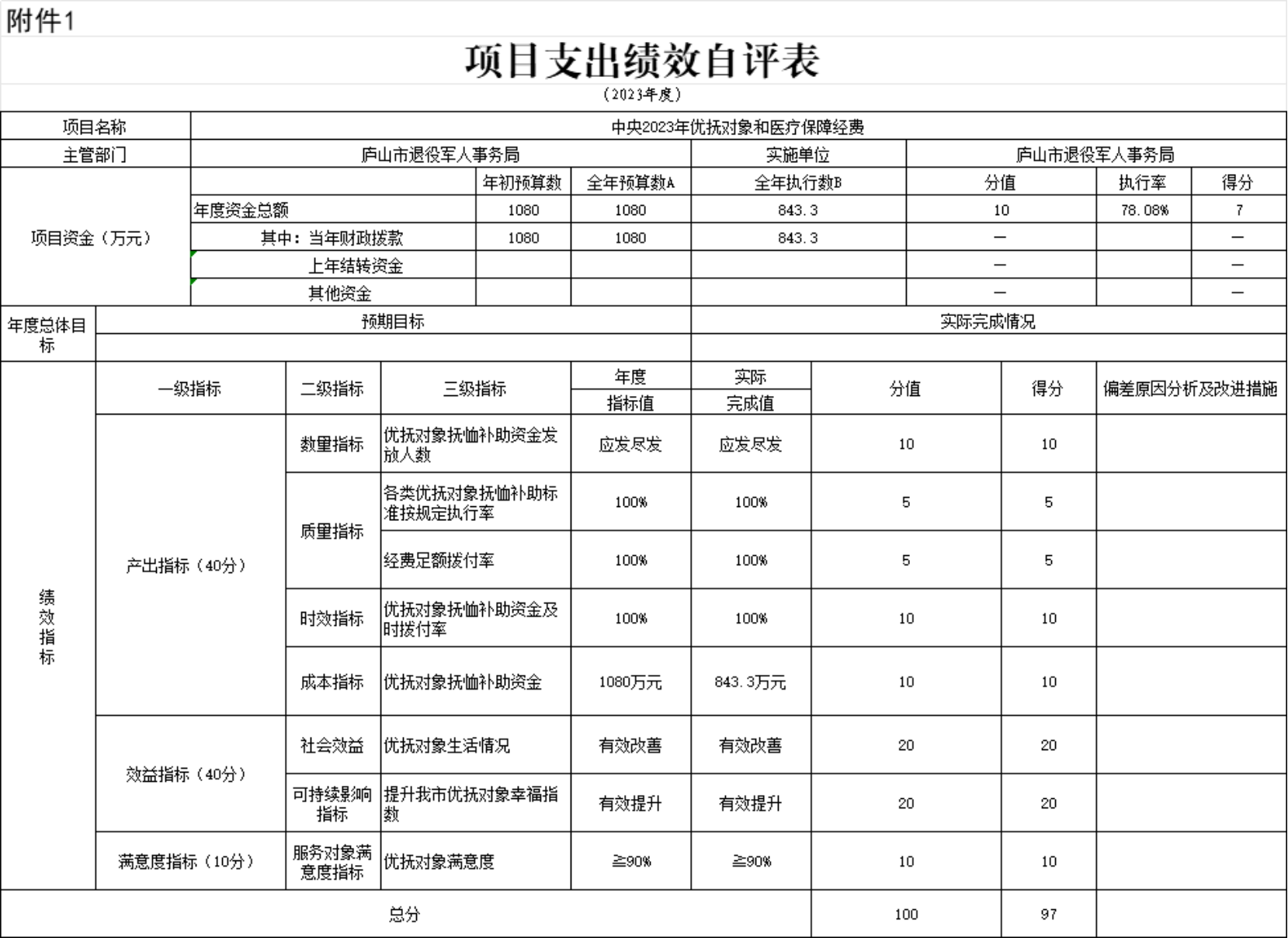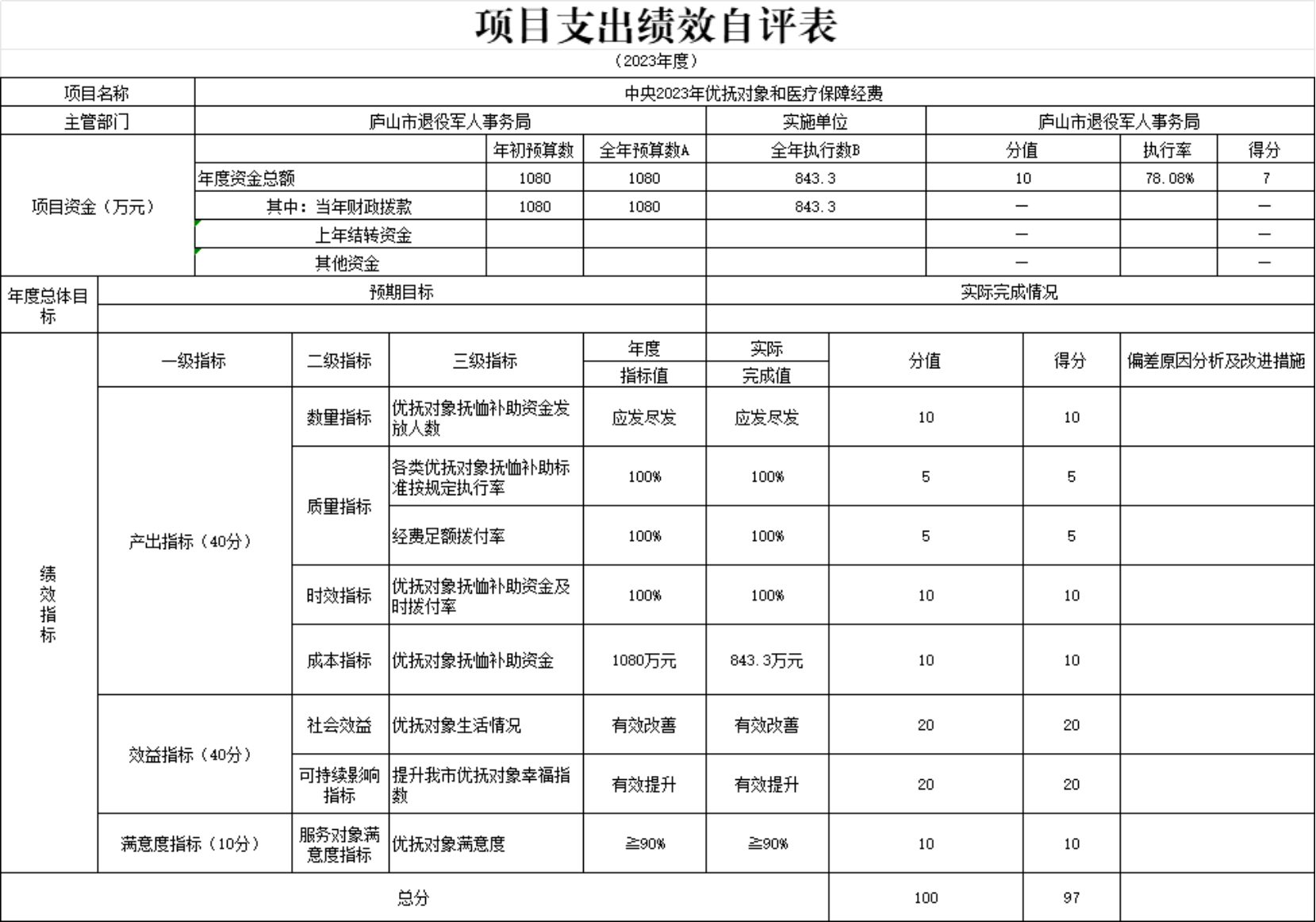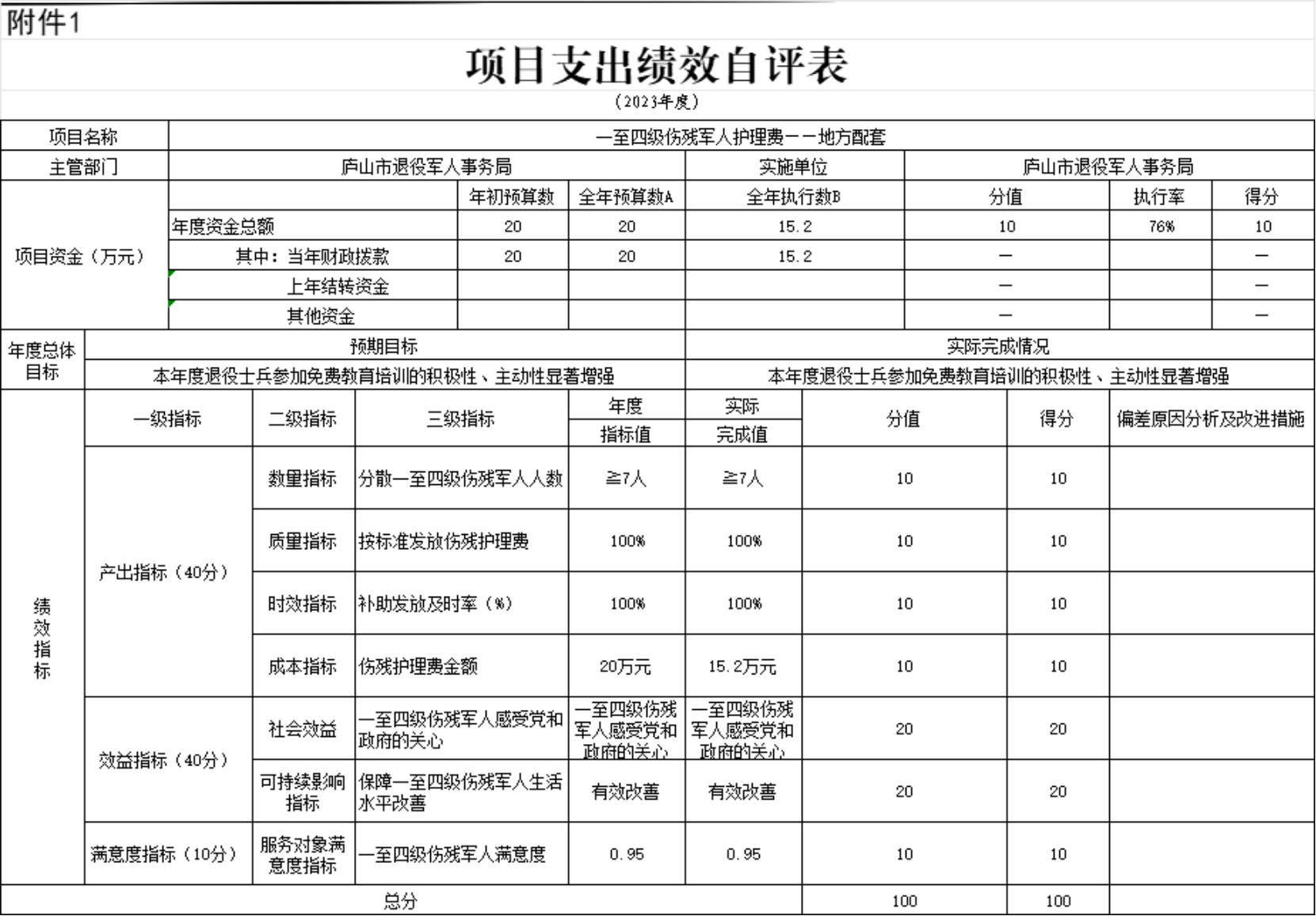 本部门“中央2023年优抚对象和医疗保障经费”、“一至四级伤残军人护理费——地方配套”项目支出绩效自评结果如下: