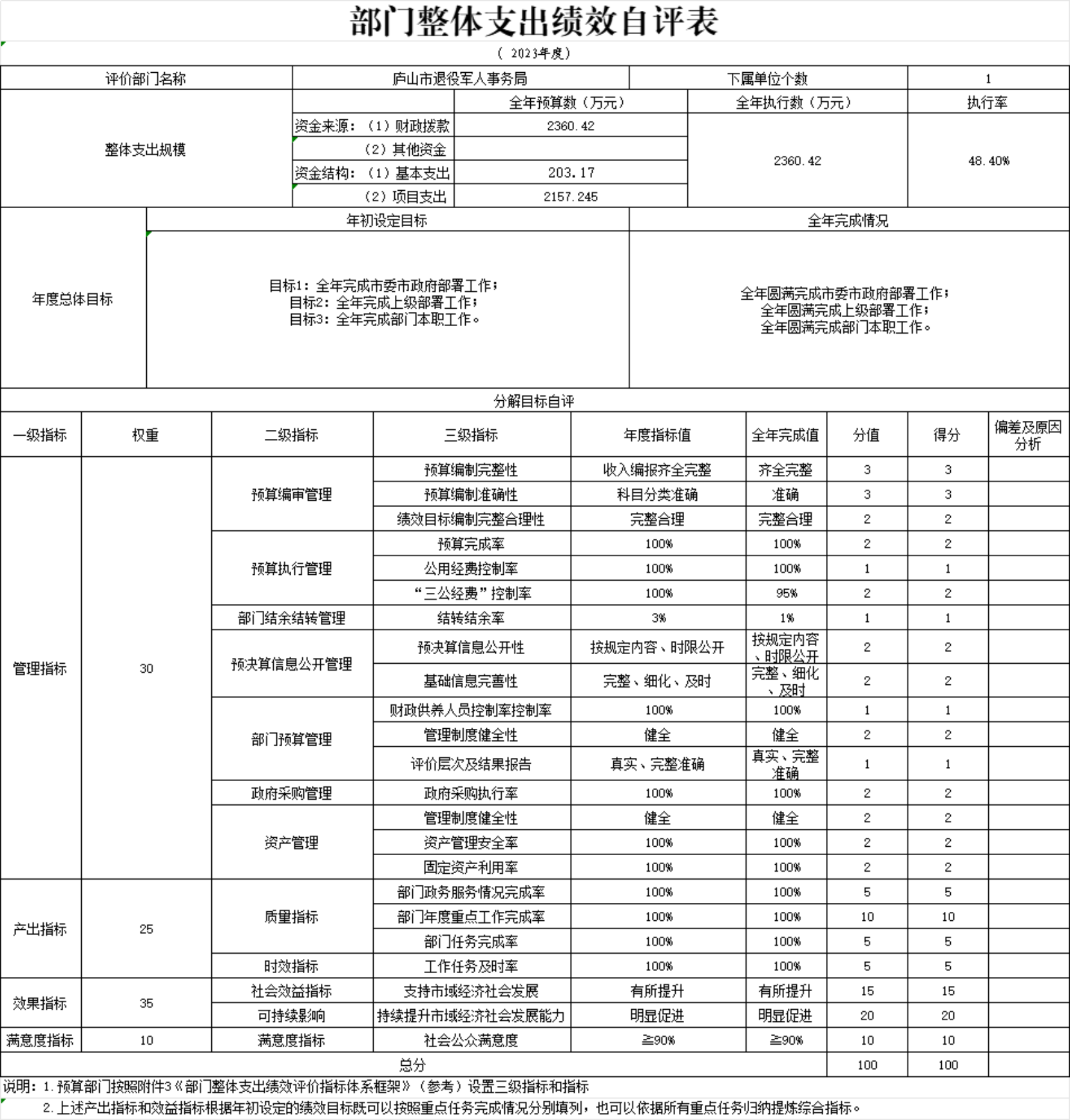 我部门今年整体绩效自评结果绩效自评总体综述:根据年初设定的绩效目标,部门整体绩效自评得分为100分。项目绩效目标情况:一是全年圆满完成市委市政府部署工作;二是全年圆满完成上级部署工作;三是全年圆满完成部门本职工作。偏离绩效目标的原因:一是个别费用支出或核算不够规范。;二是重点项目绩效管理方案不健全。下一步改进措施:一是加强财务管理相关制度的学习,今后严格按照相关财务管理规定进行财务核算;二是加强重点工作的质量管理及结果考核。绩效评价等次为“优秀”。