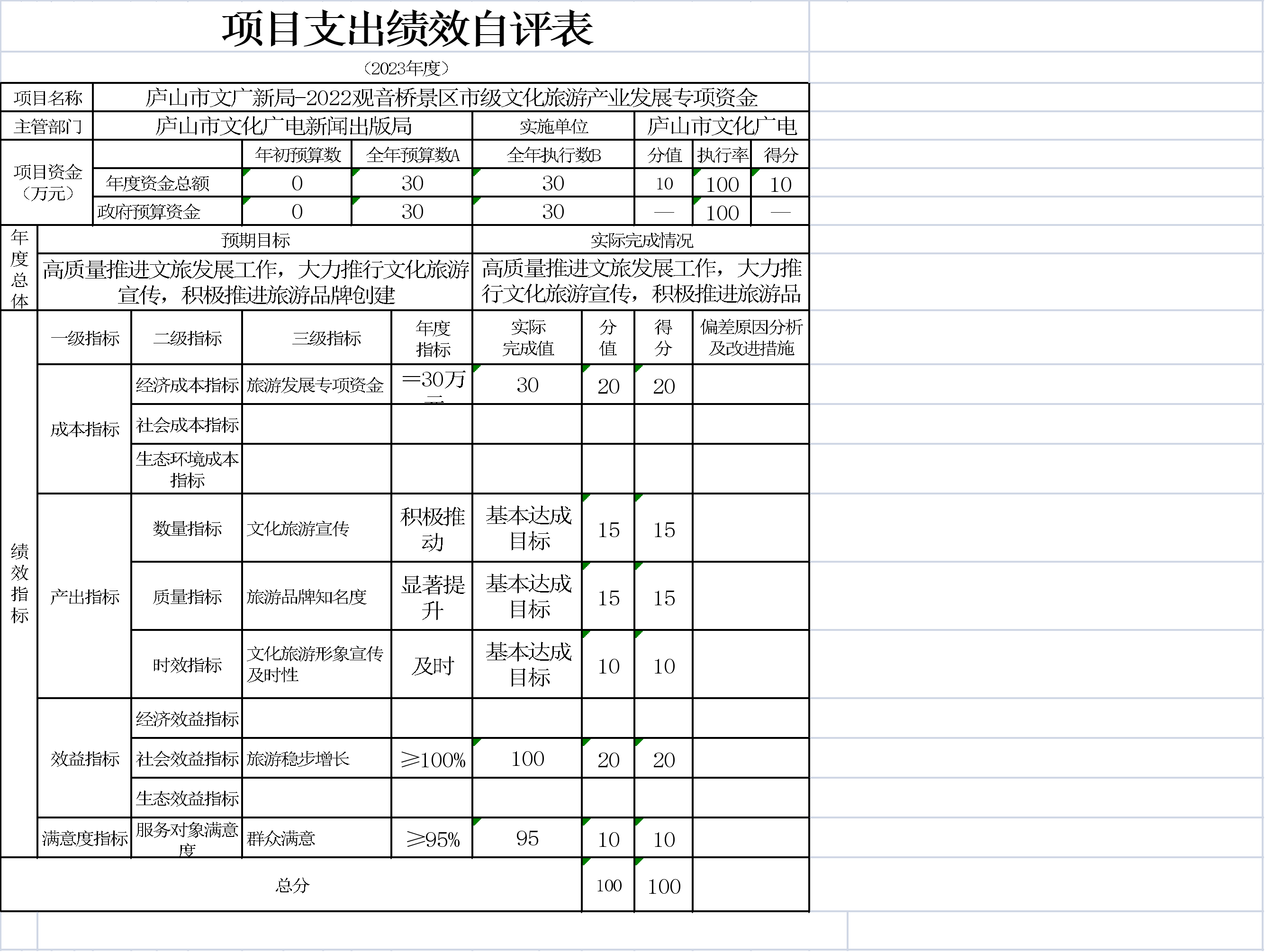 组织对“旅游发展专项资金”、“公共文化服务体系建设中央资金”、“文旅产业发展旅游奖补资金”等21个项目开展了单位评价,涉及一般公共服务预算支出4531.87万元,政府性基金预算支出0万元,国有资本预算支出0万元。从评价情况来看,严格按照庐山市财政局要求开展项目预算绩效一体化申报,有项目才有资金,根据项目进度支付资金。项目资金从资金落实、业务管理到财务管理、项目产出、项目效益,各级指标得分都很高。