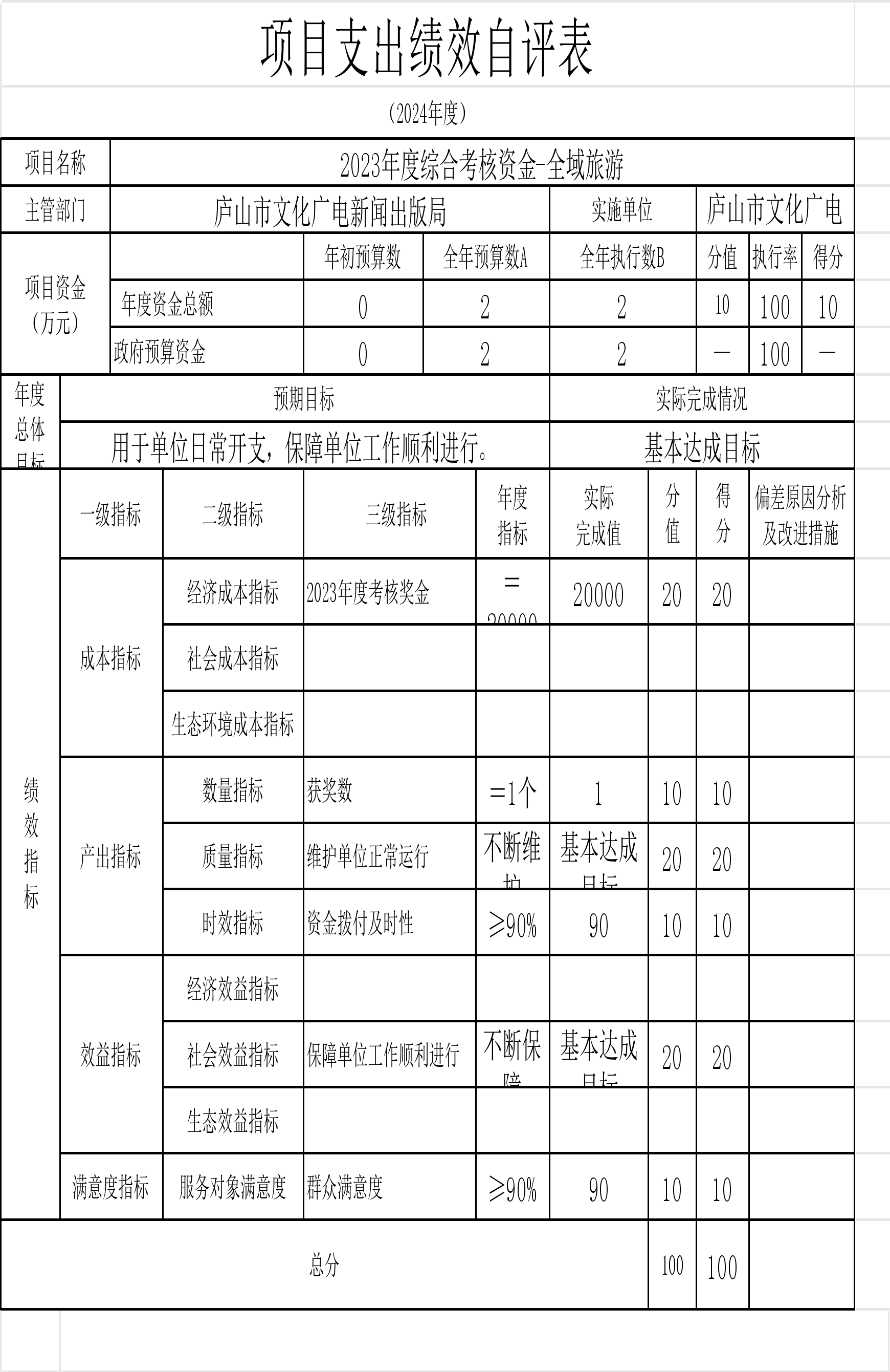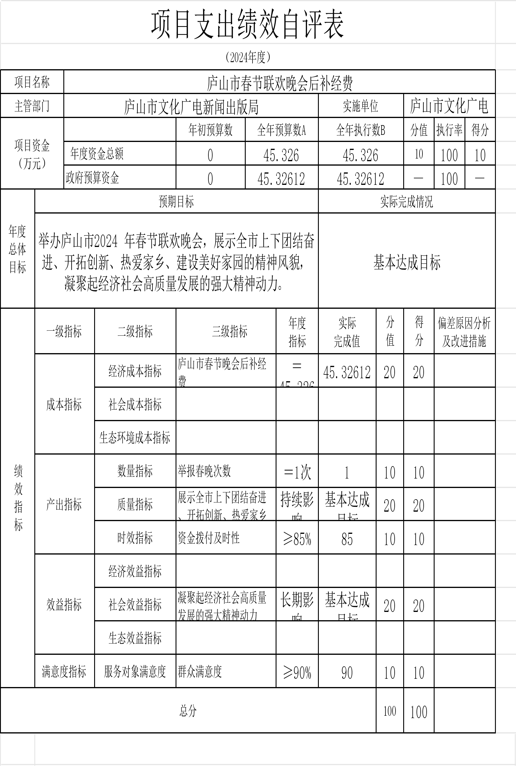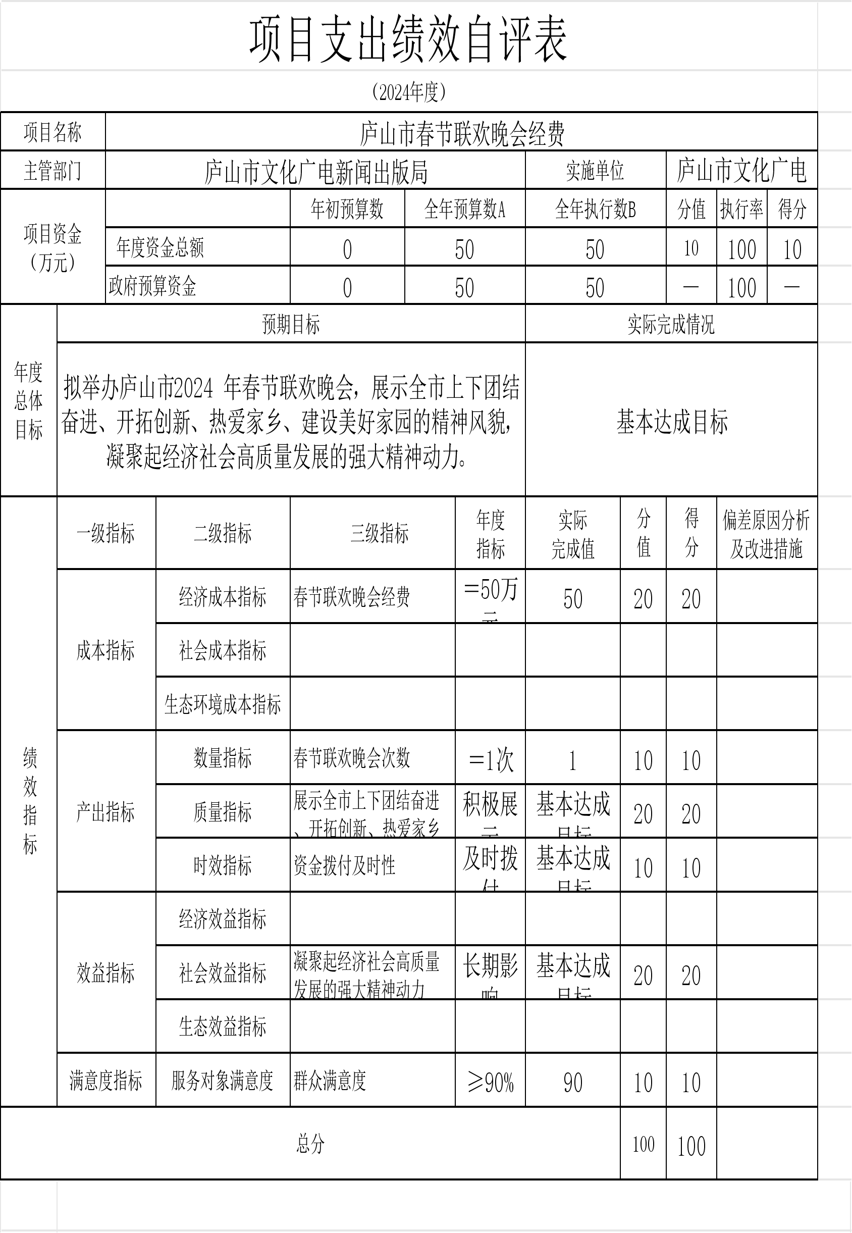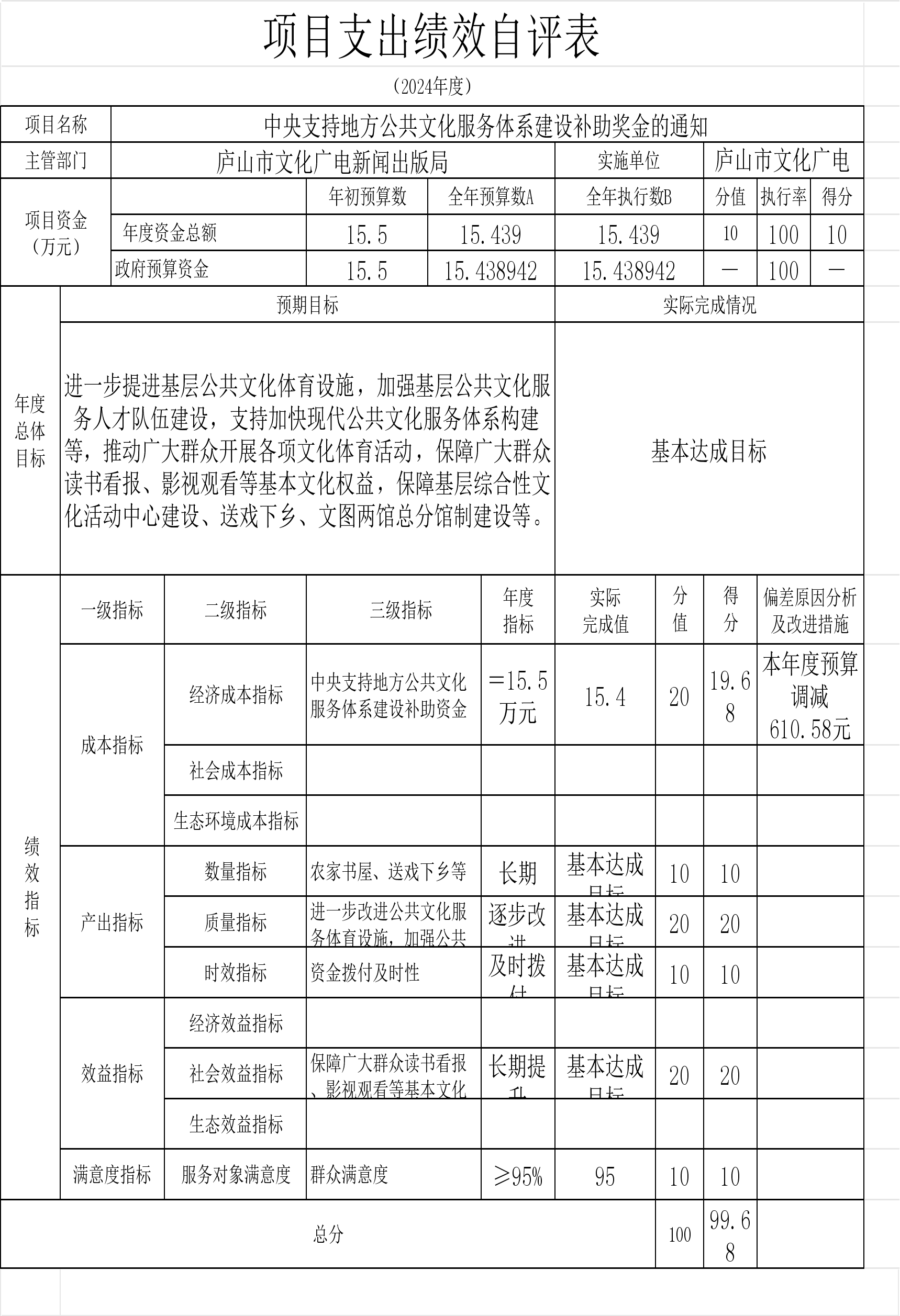 本单位“中央支持地方公共文化服务体系建设补助奖金的通知”、“庐山市春节联欢晚会经费”等项目支出绩效自评结果如下: