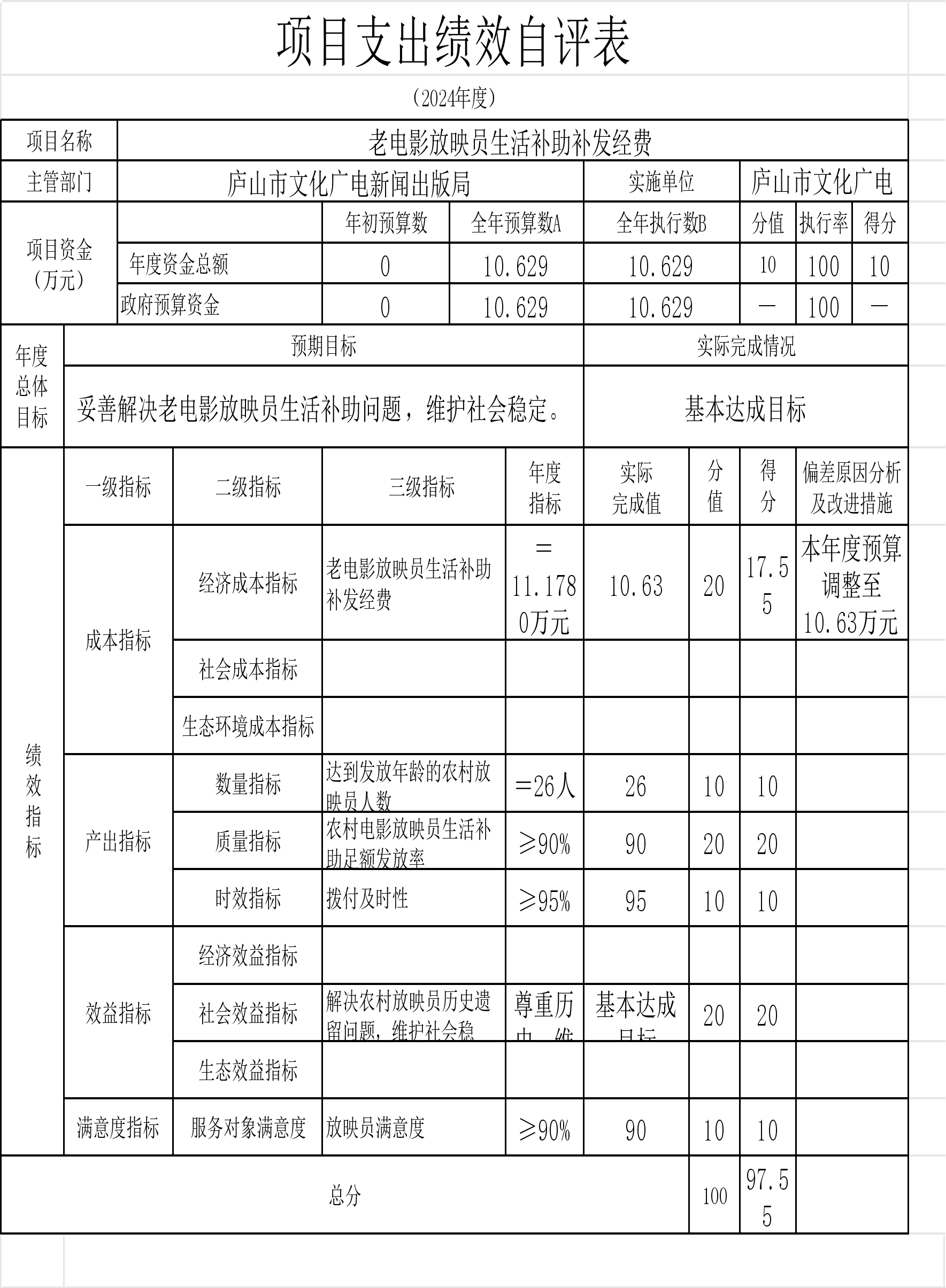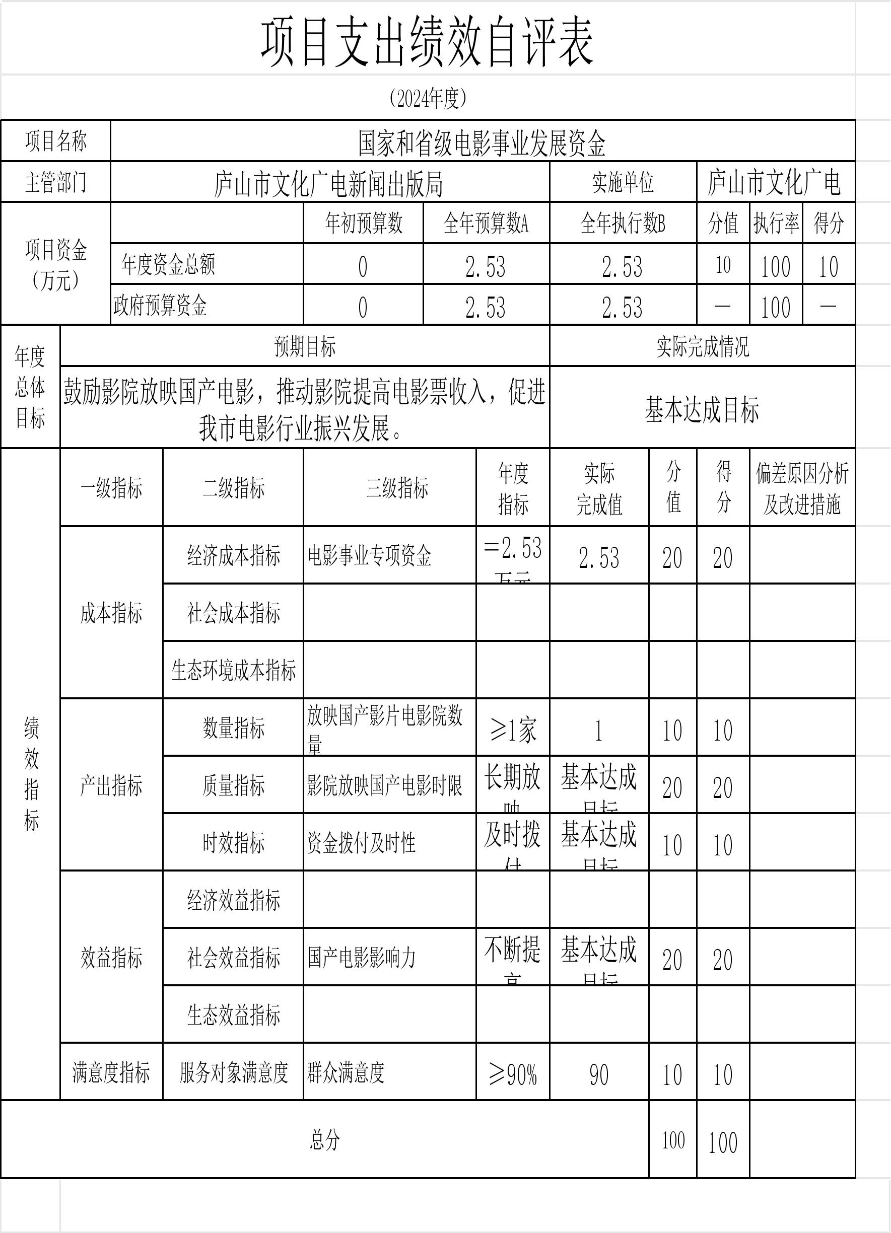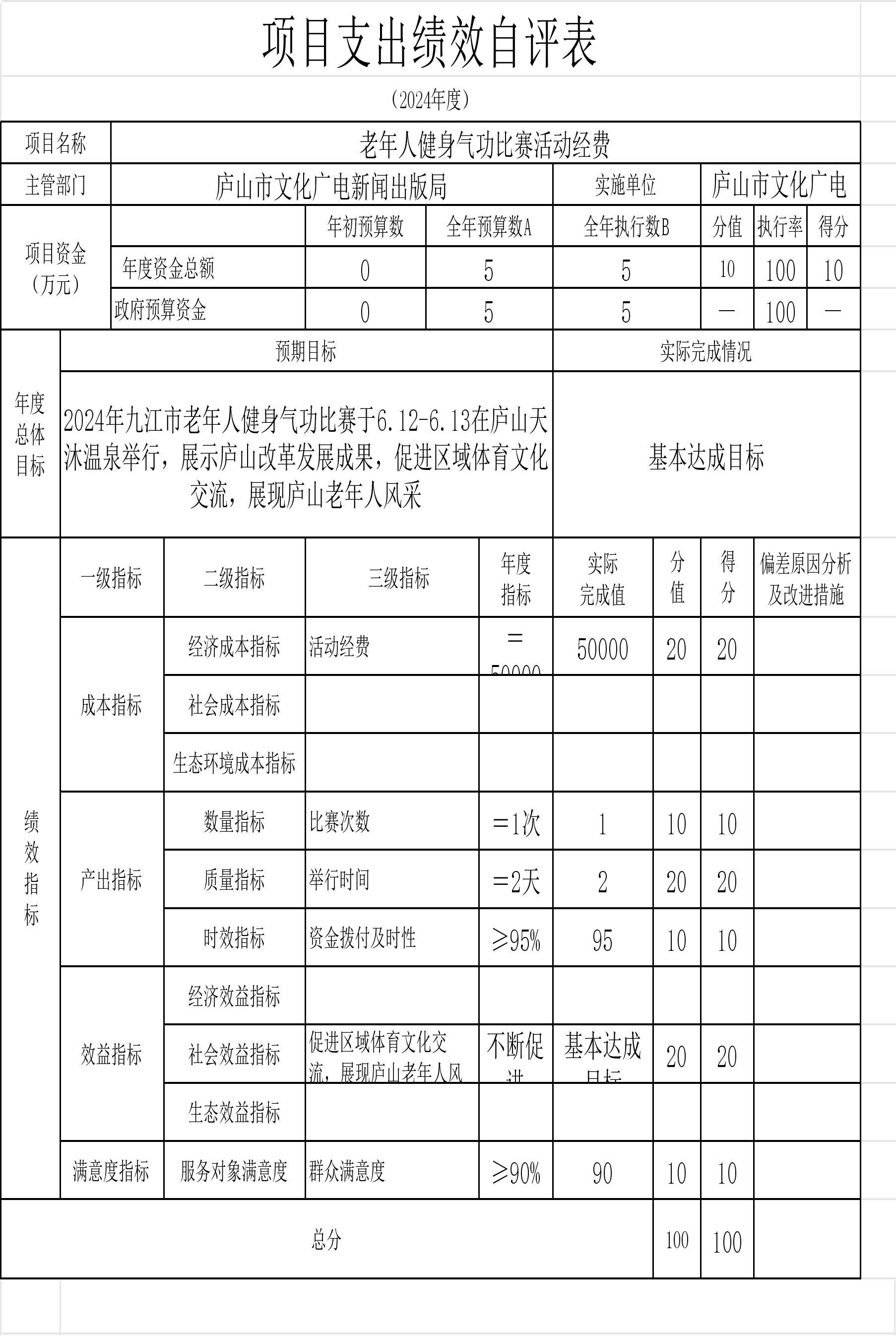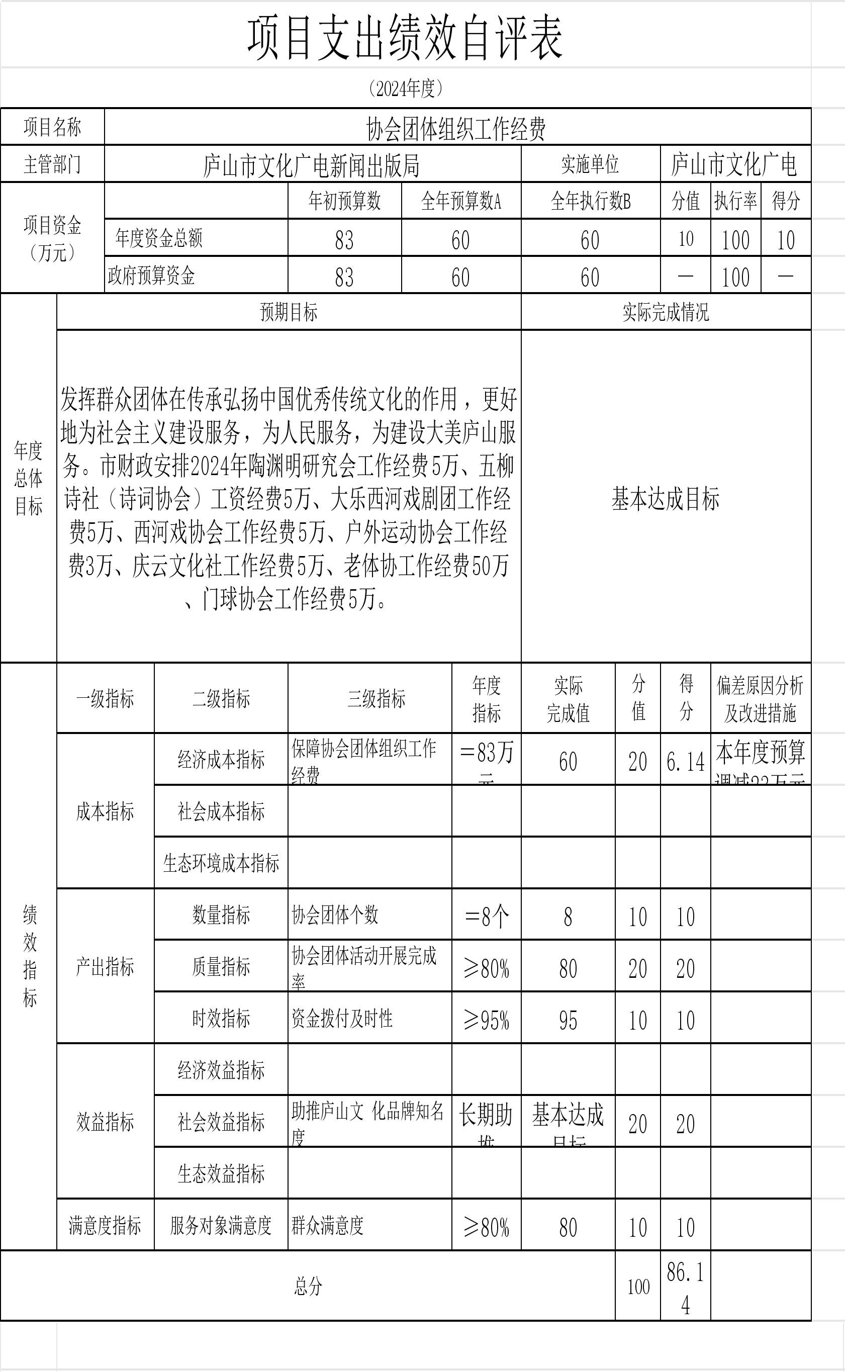 本单位“中央支持地方公共文化服务体系建设补助奖金的通知”、“庐山市春节联欢晚会经费”等项目支出绩效自评结果如下: