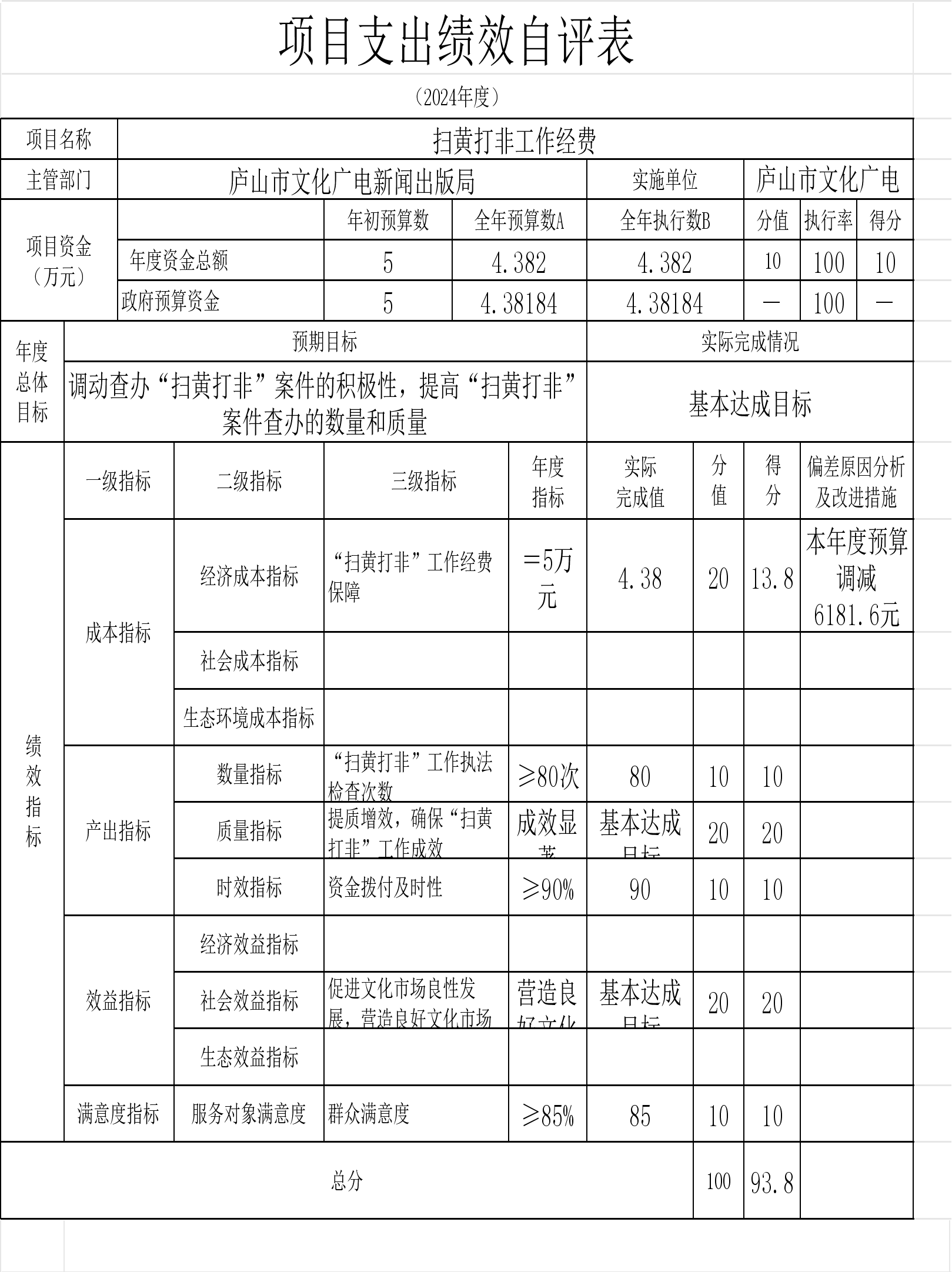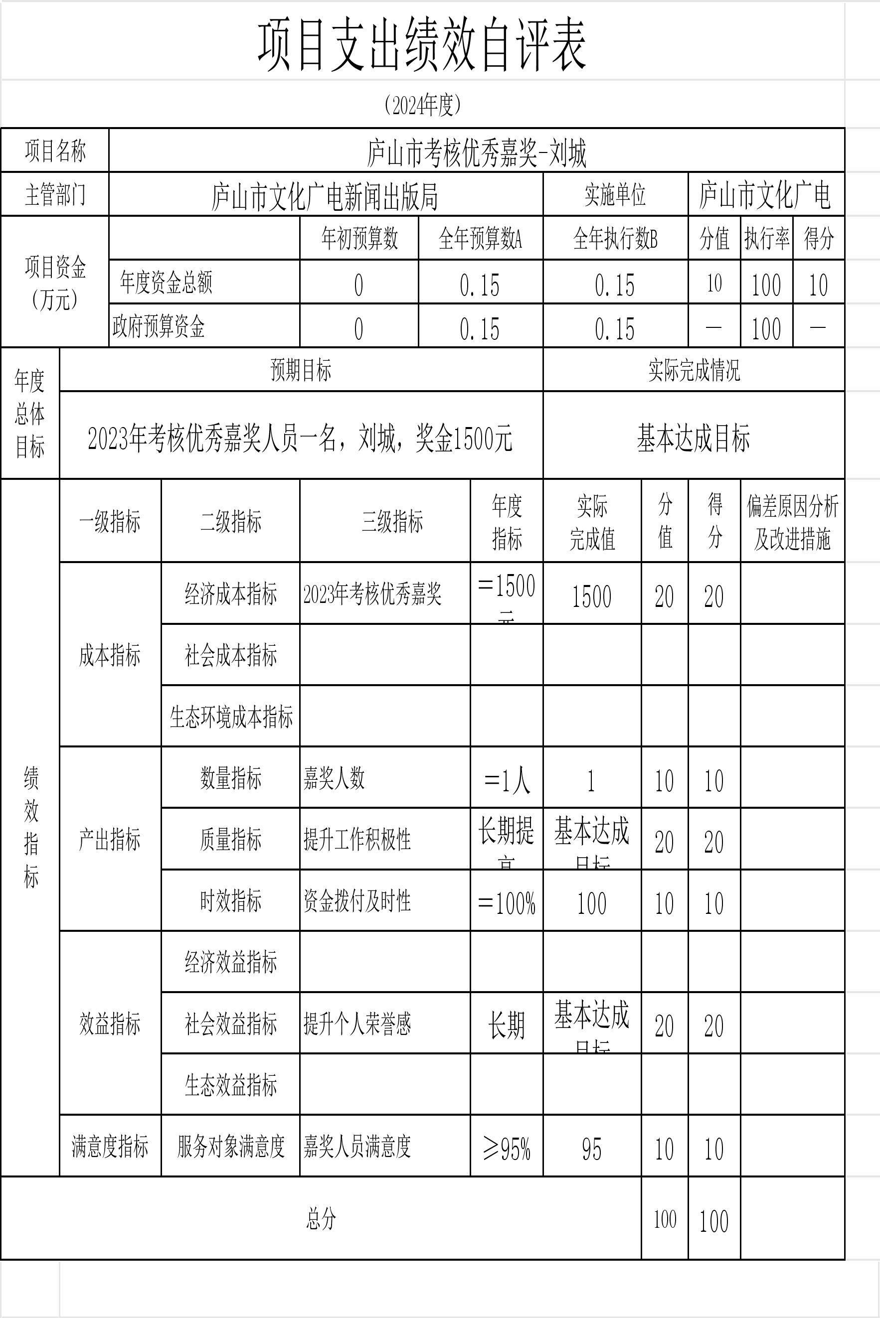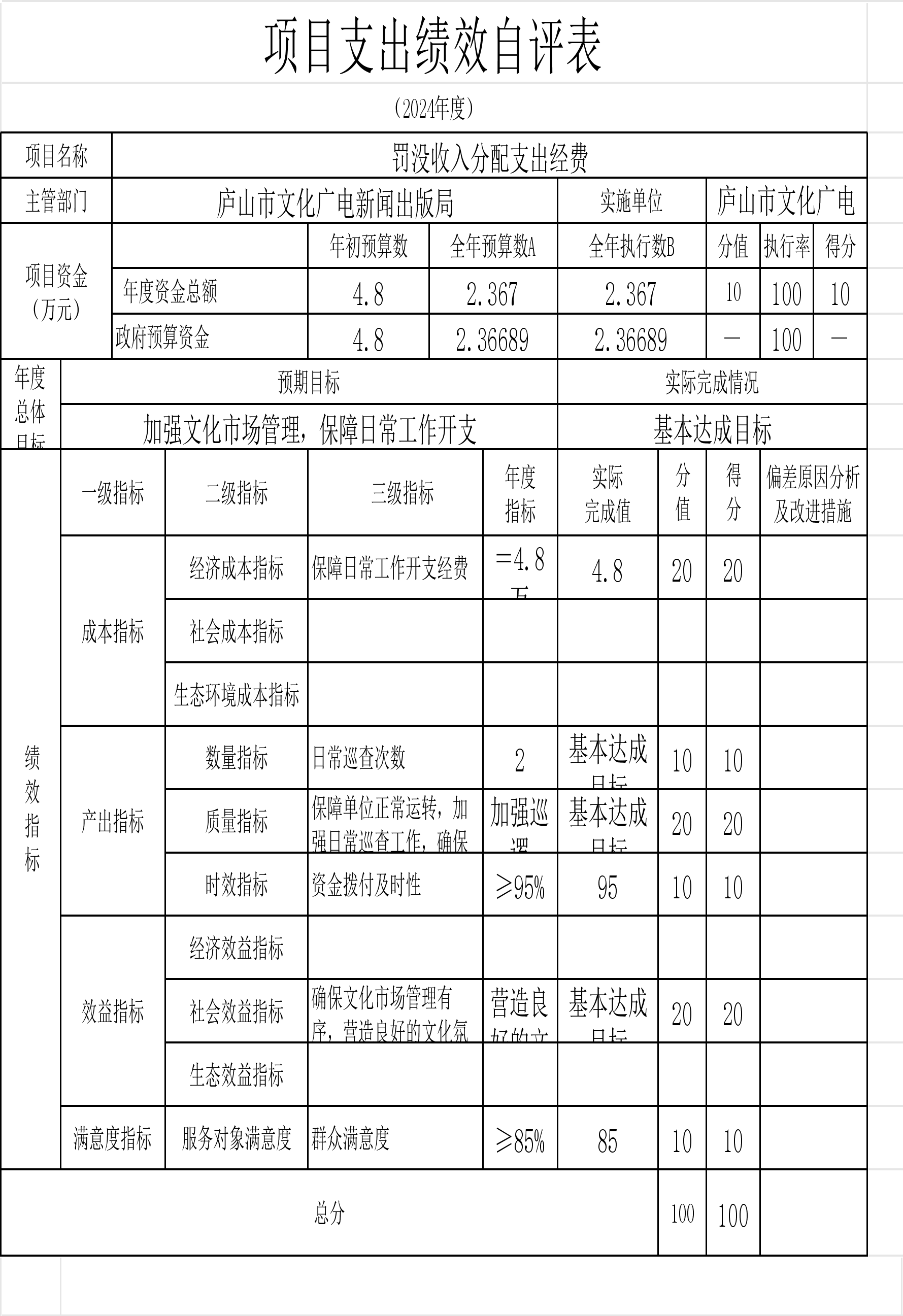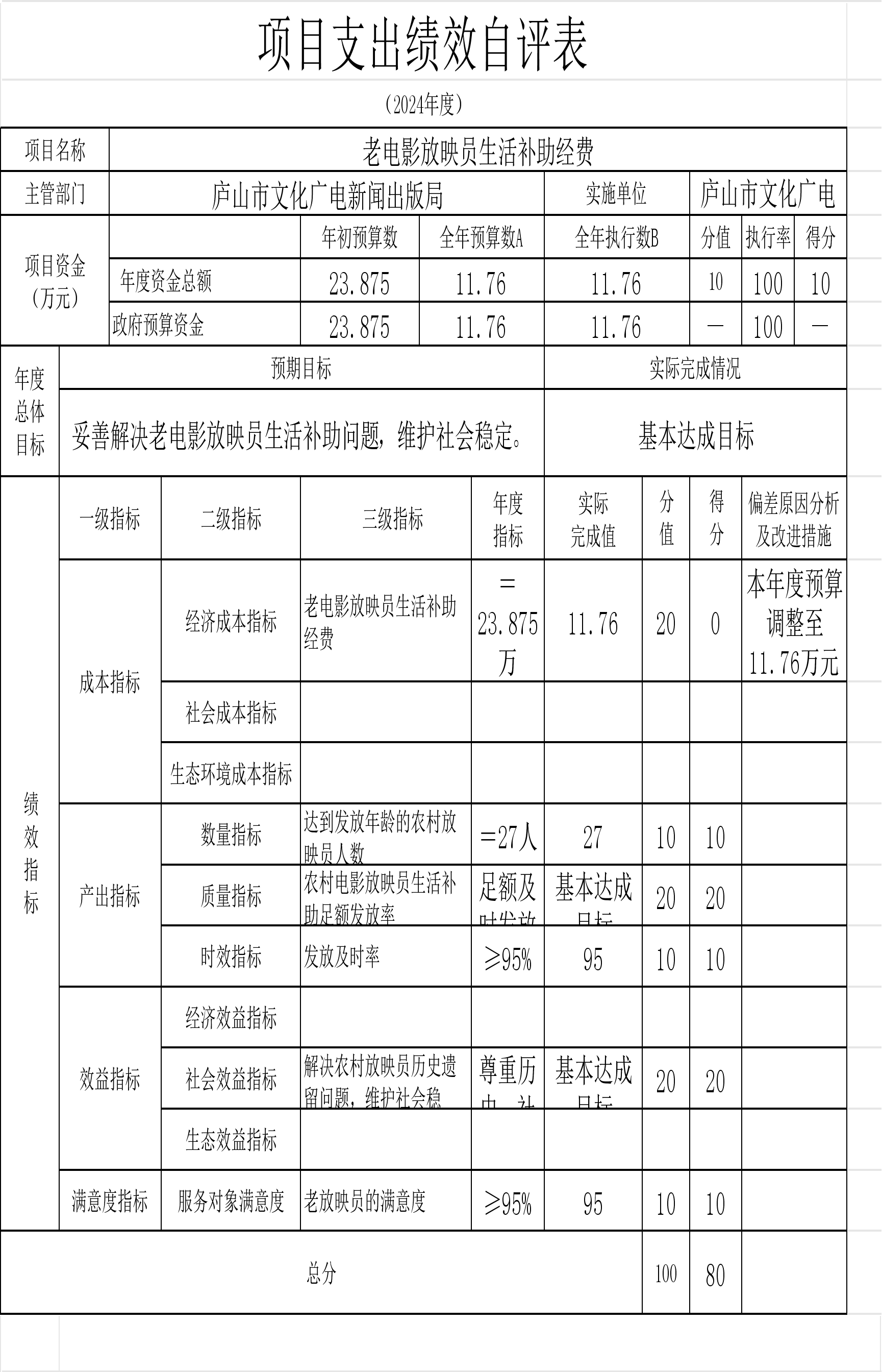 本单位“中央支持地方公共文化服务体系建设补助奖金的通知”、“庐山市春节联欢晚会经费”等项目支出绩效自评结果如下: