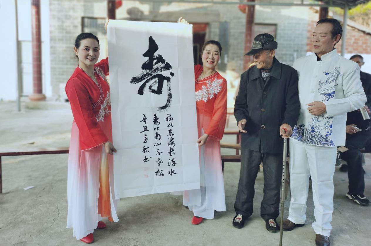 “我们的未来,在希望的田野上,人们在明媚的阳光下生活,生活在人们的劳动中变样,老人们举杯(那个)孩子们欢笑”伴随着优美的旋律,欢乐的舞蹈《在希望的田野上》在蛟塘镇蛟塘村精彩开场,村民们看得聚精会神,掌声不断。该村91岁的周从仁老人高兴的说:“现在党的政策好,不仅送戏到家门口,还可以点自己喜欢的节目,真是太好了!”文化馆退休干部胡代延还在现场书写一幅“寿”字赠与周从仁老人,老人家笑的合不拢嘴。